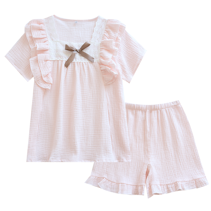 ins简约清新蕾丝纯棉纱布睡衣女夏季短袖短裤韩版家居服两件套装