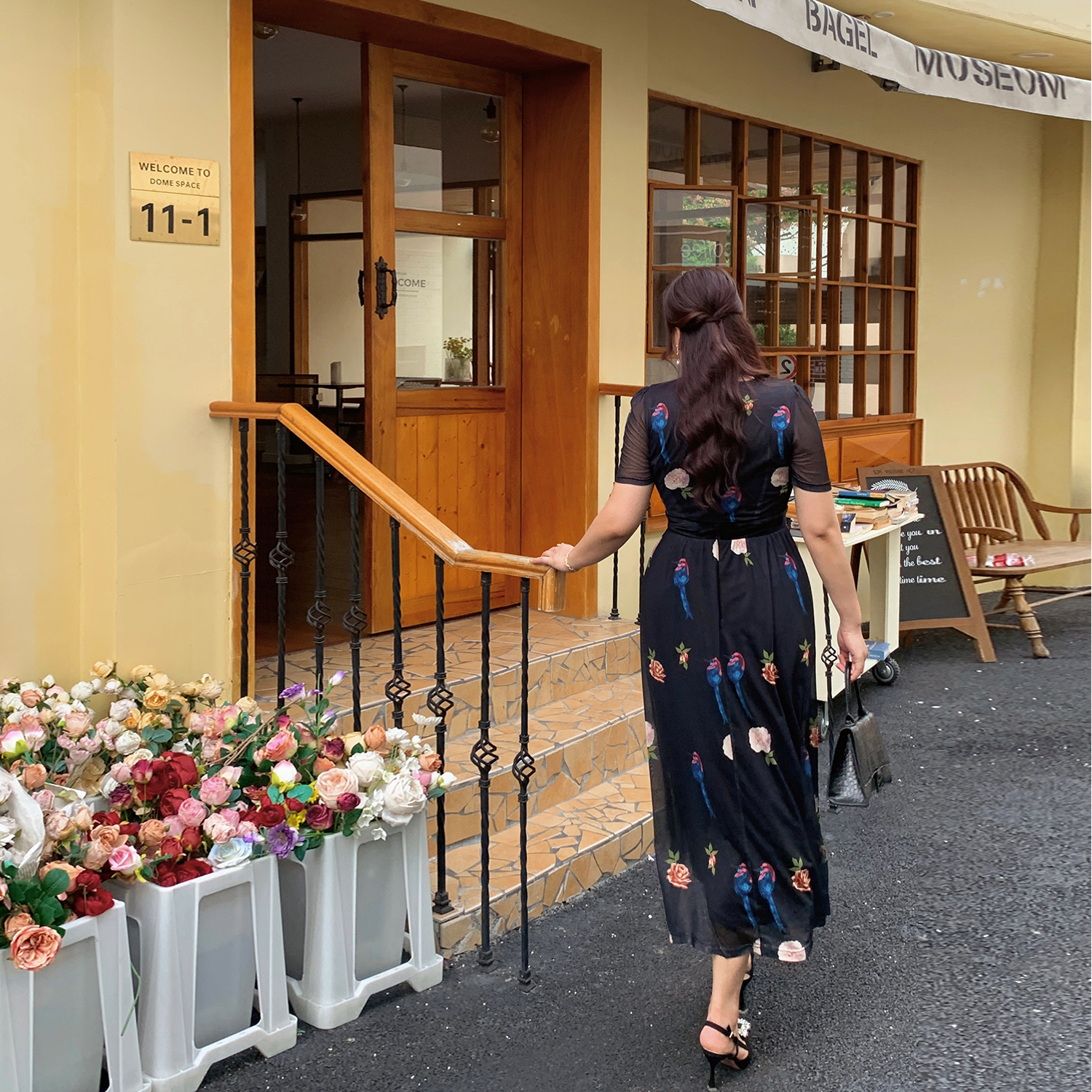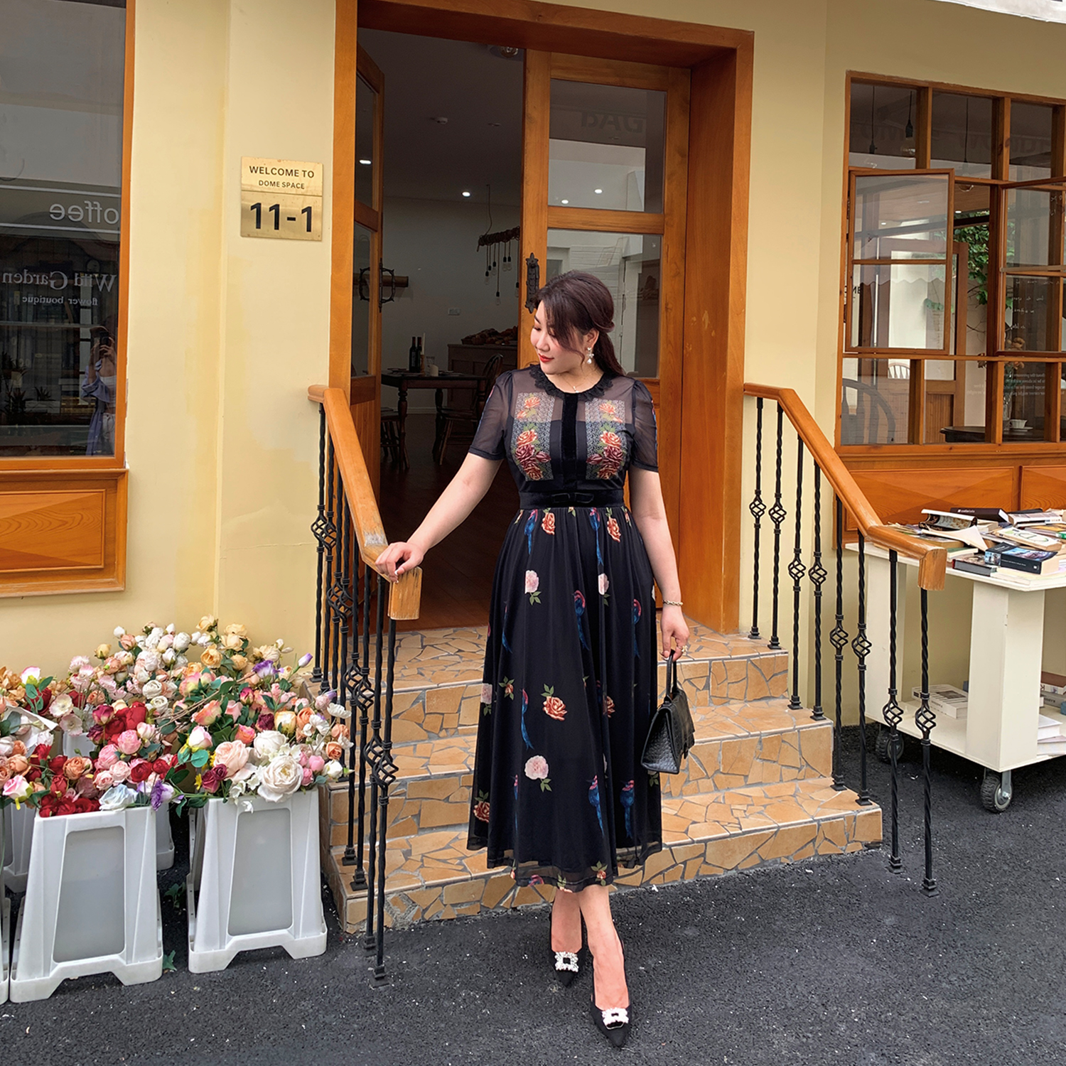 GLEC大码女装高端轻奢2025夏新款奢华时尚网纱拼接黑色印花连衣裙