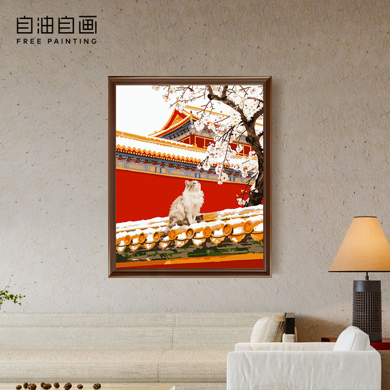 自油自画数字油画diy故宫系列手工填色减压装饰画涂色 红檐雪枝猫