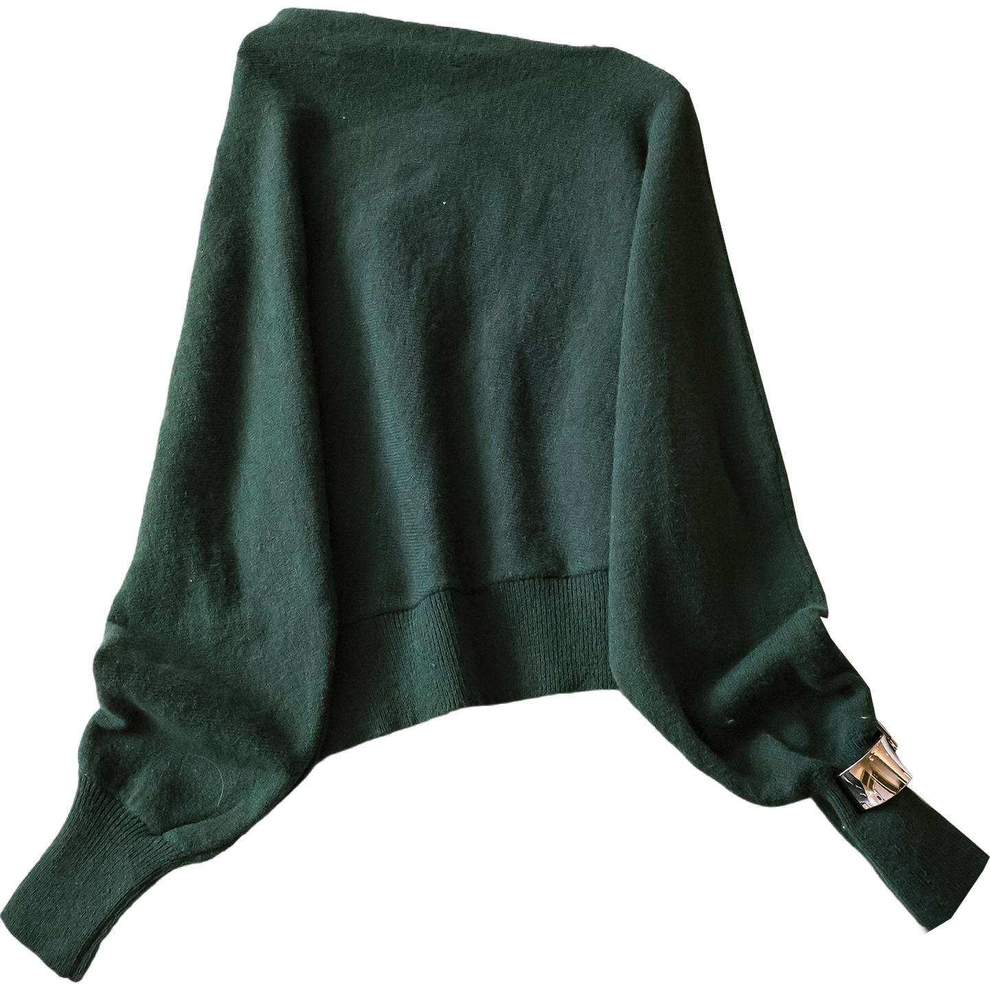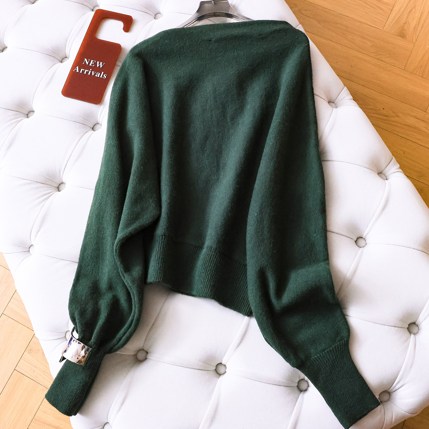 可拆卸金属装饰斜肩一字领蝙蝠袖宽松套头针织衫长袖女装毛衣Q375