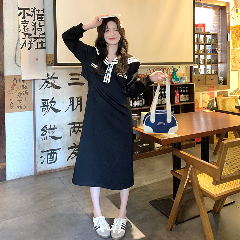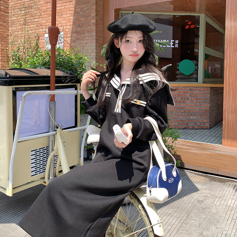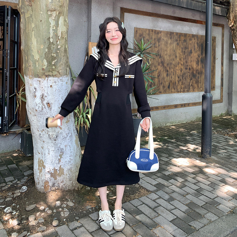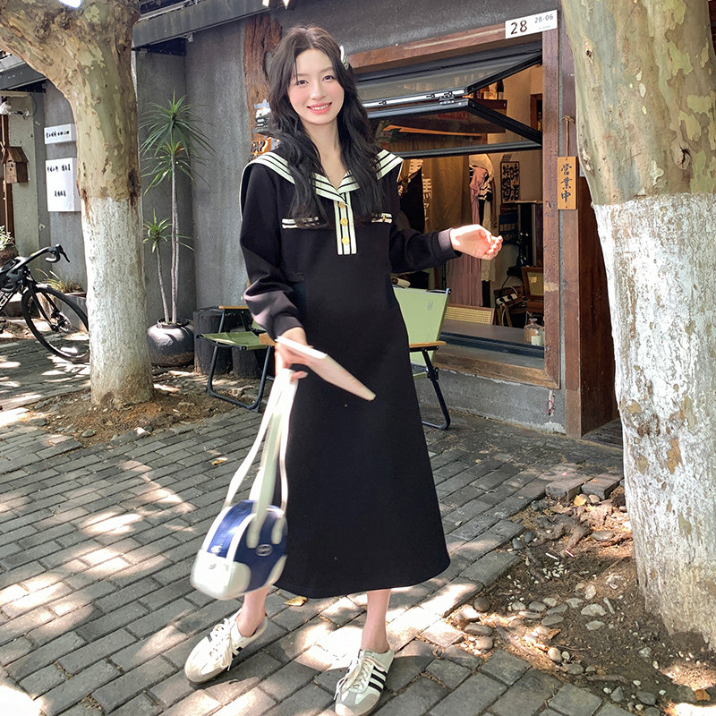 黑色韩系学院风海军领连衣裙女2026春季新款设计感减龄撞色A字裙