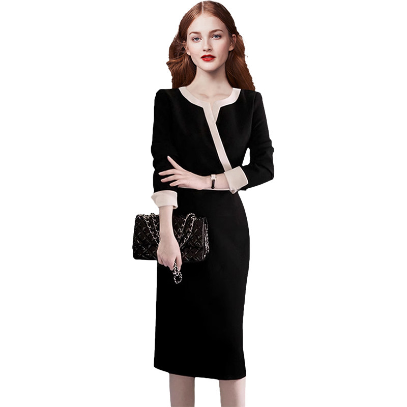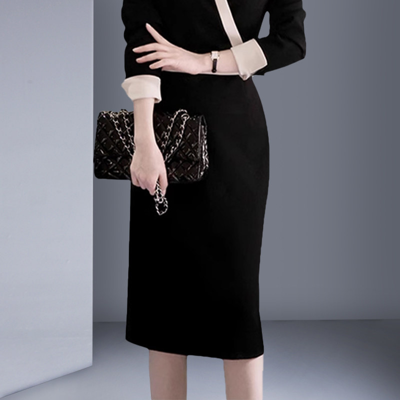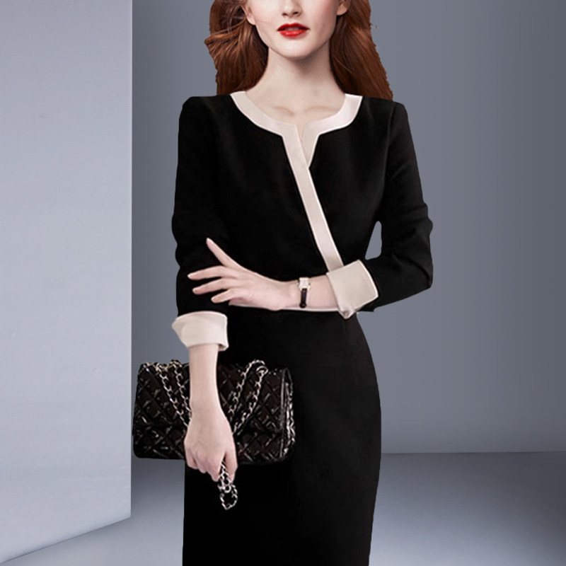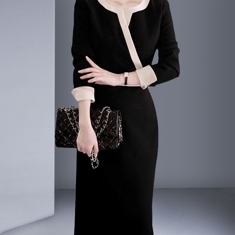高级感轻奢名媛优雅气质显瘦连衣裙2025秋季新款修身包臀V领拼色