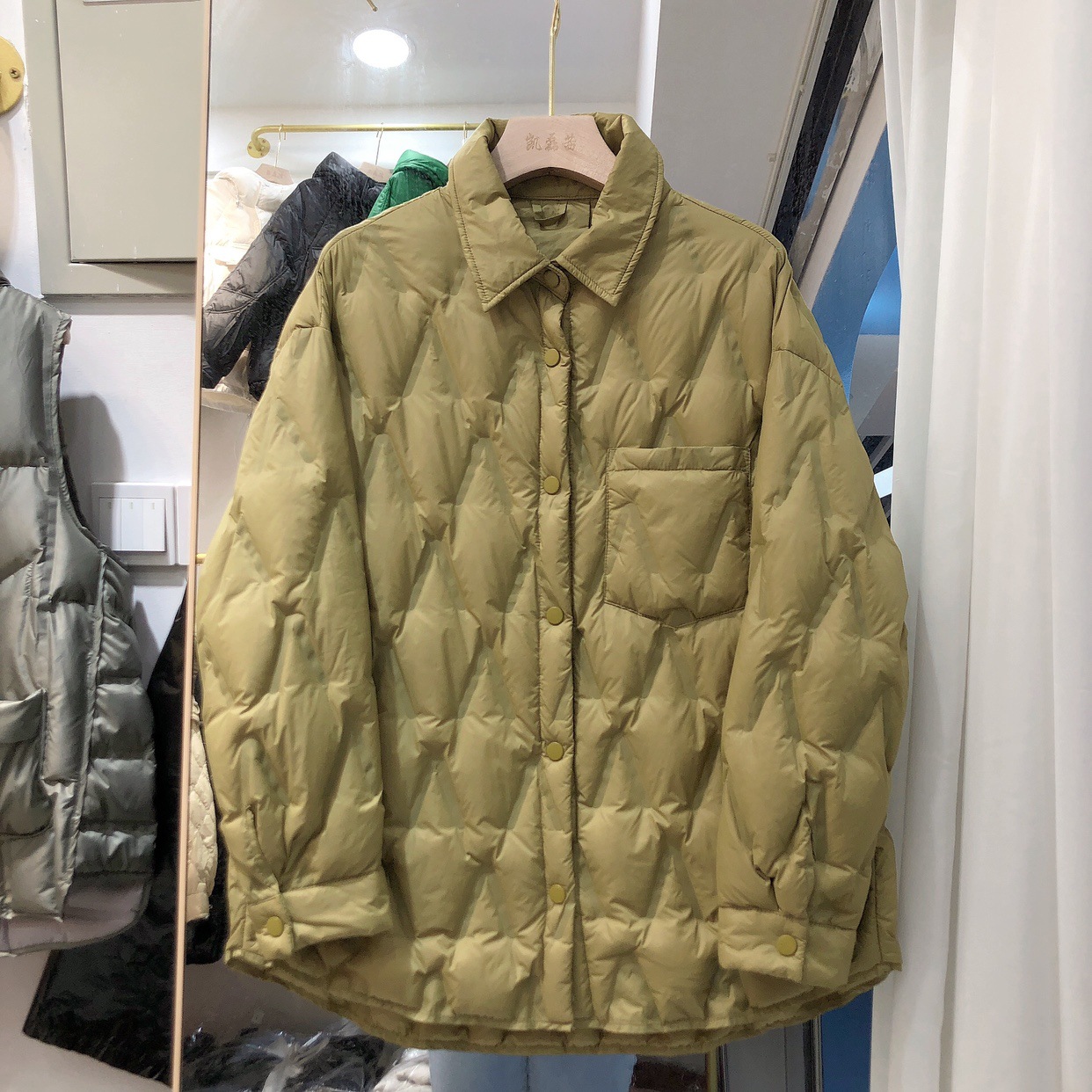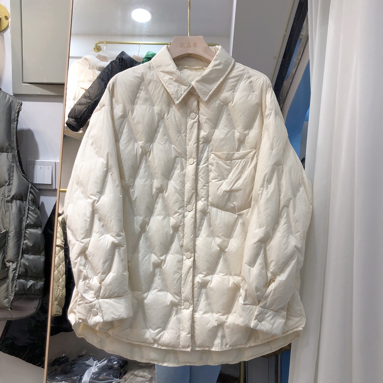 韩版秋冬新款气质羽绒服衬衫领菱格纹口袋宽松文艺休闲白鸭绒