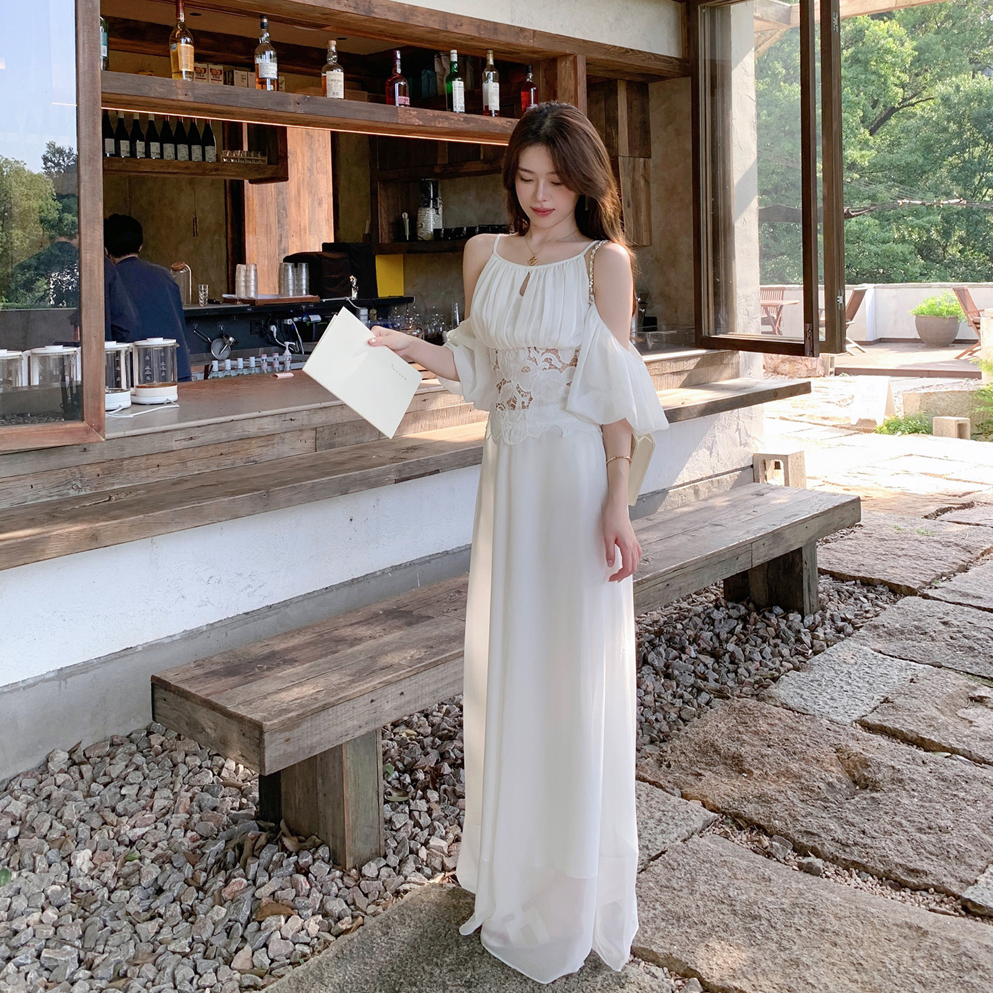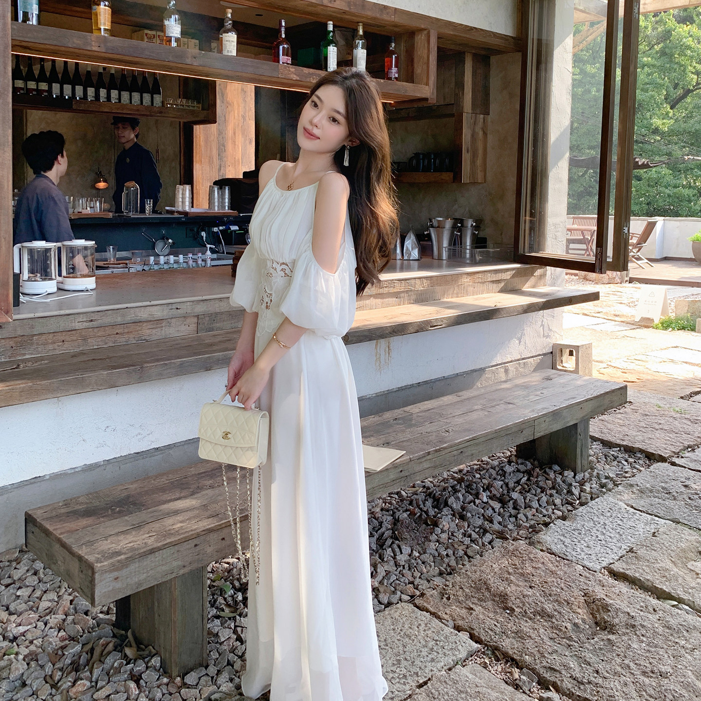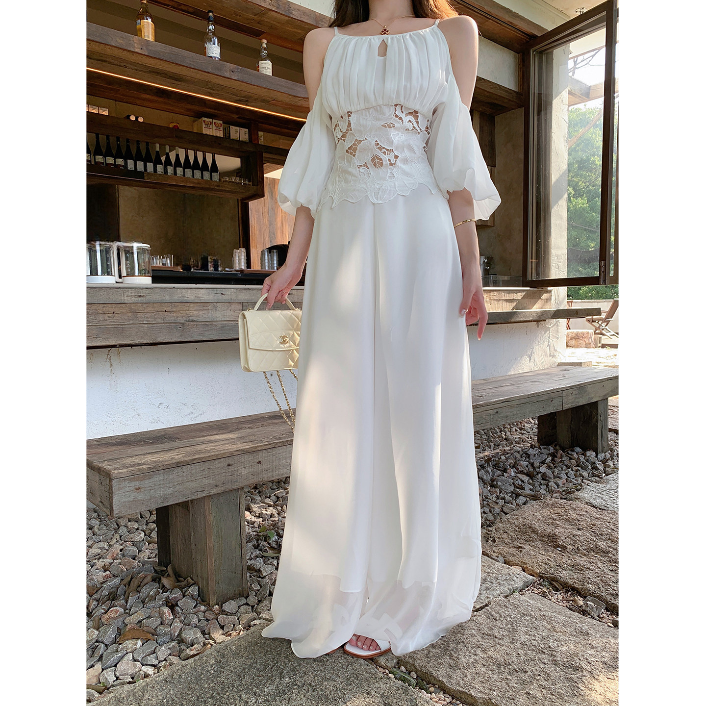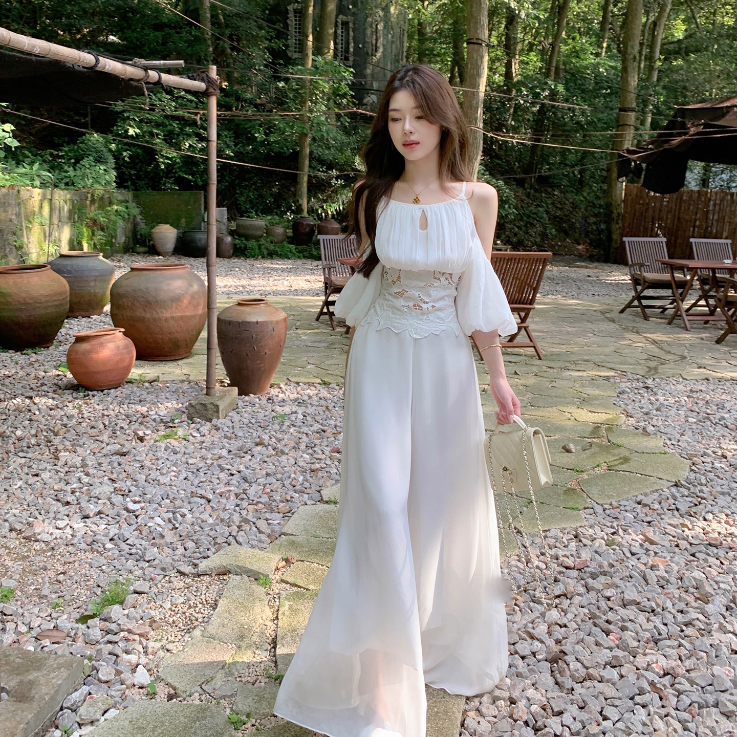 ByYou 早秋新款灯笼袖重工蕾丝拼接白色雪纺衫女露肩显瘦吊带上衣