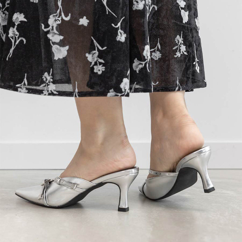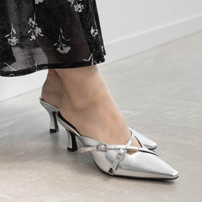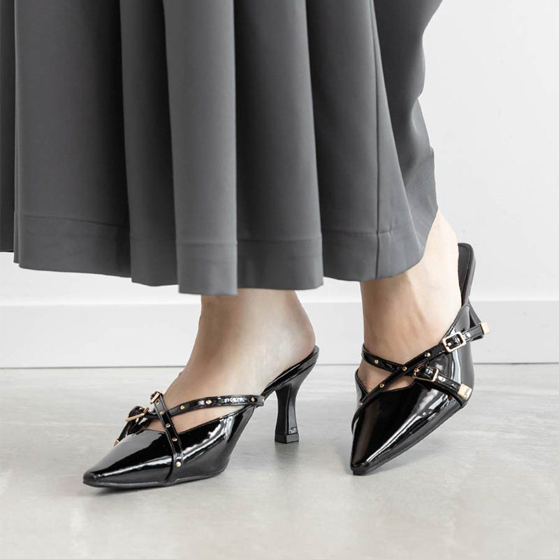 RANDA 25早秋新款迷你铆钉交叉带细跟尖头穆勒高跟鞋 PD36095
