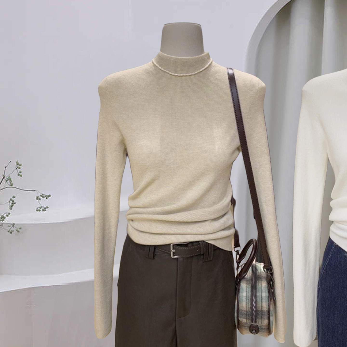 奶杏色半高领针织打底衫女2025新款韩版软糯内搭修身套头毛衣上衣
