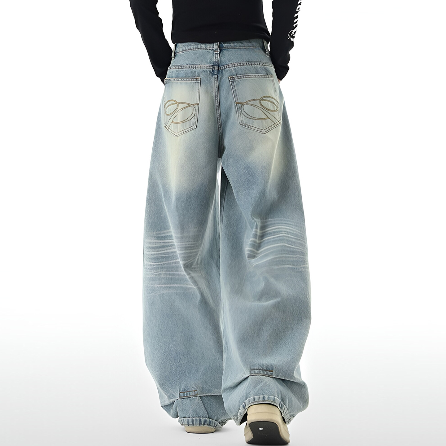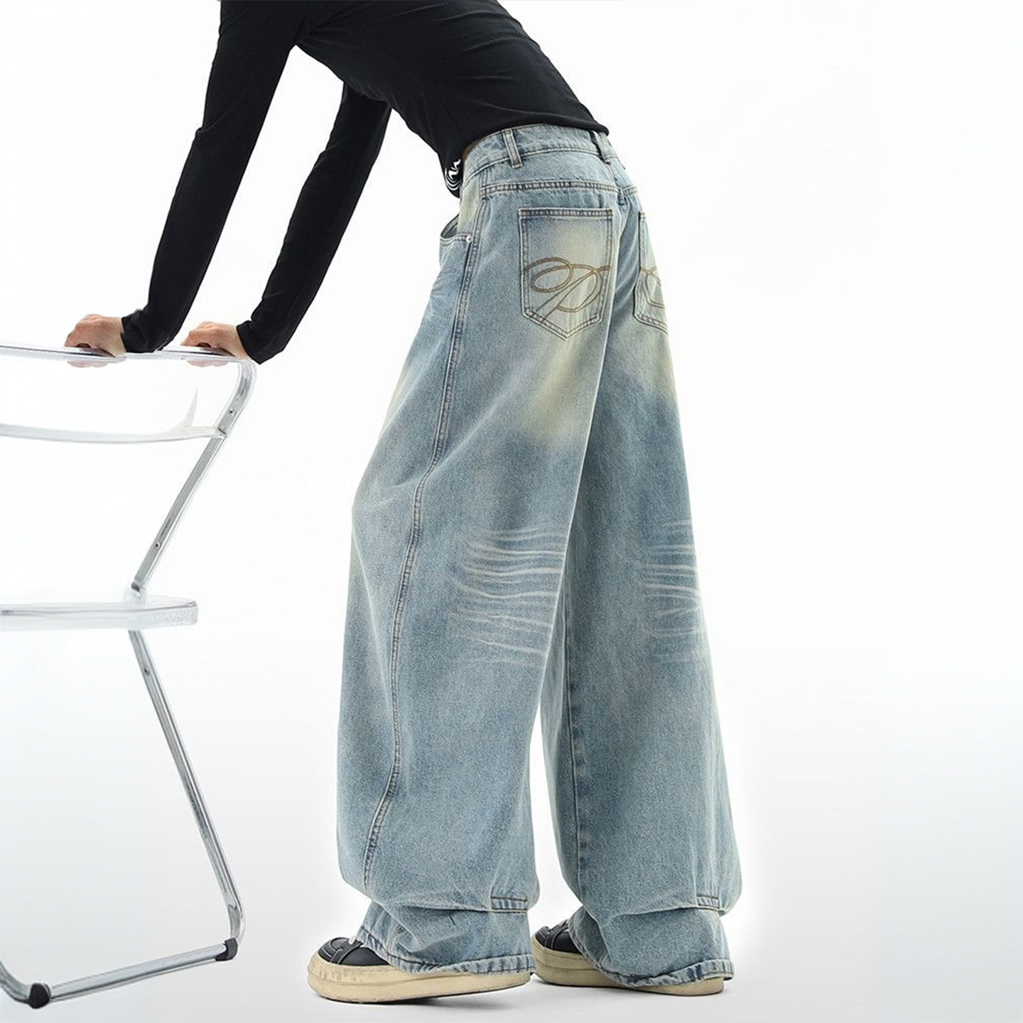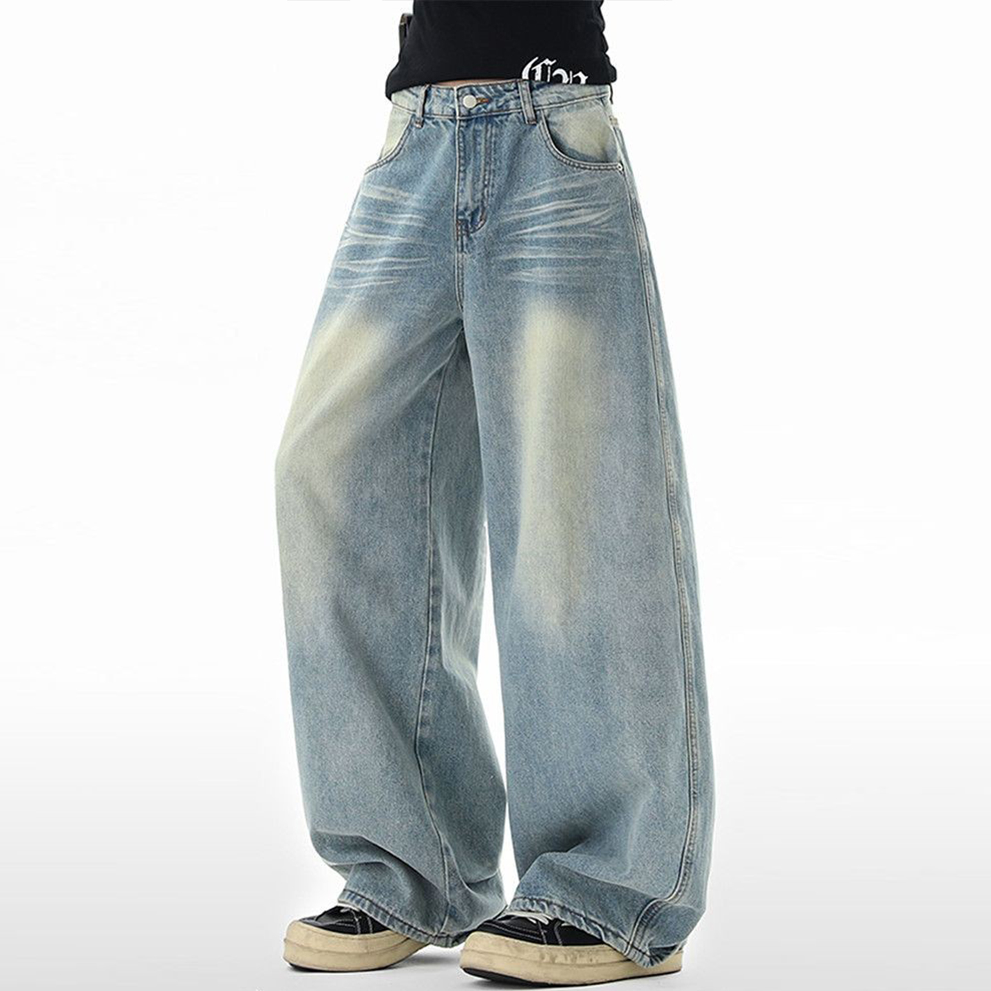 300斤大码女装蓝色简约风牛仔裤女胖mm设计感高街vibe风阔腿裤子