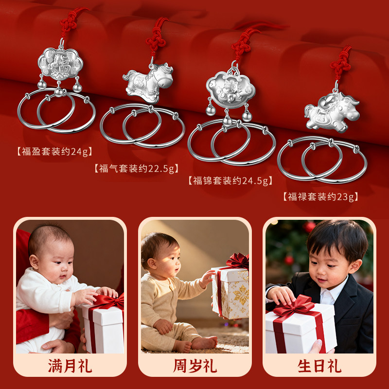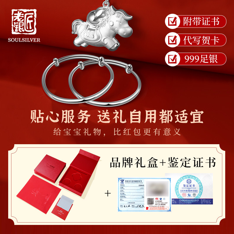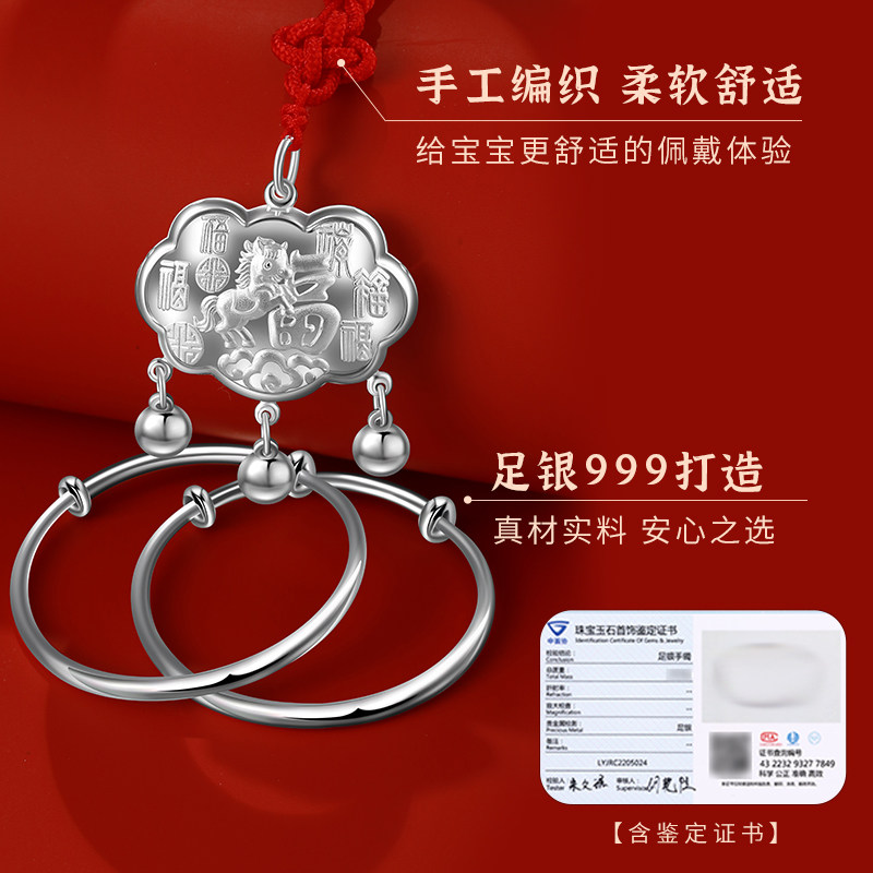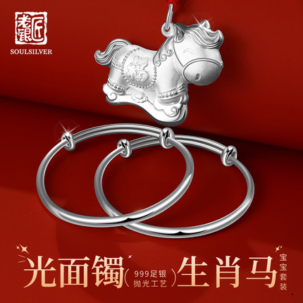 老银匠s999足银生肖马长命锁光面宝宝手镯纯银本命年满月百天礼物