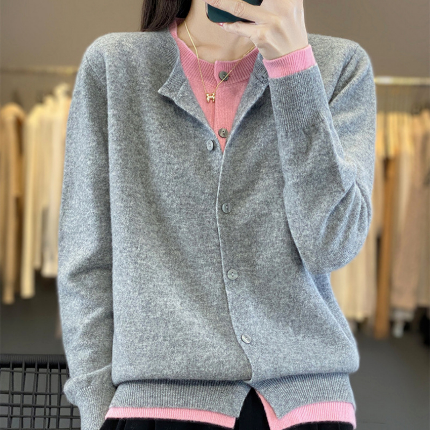 秋款假两件纯羊毛衫100%羊毛开衫女装春秋款针织羊毛衫圆领开衫