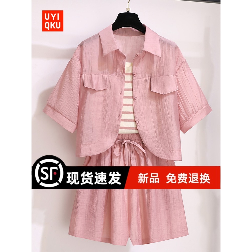 欧洲站冰丝条纹吊带薄款雪纺短袖衬衫套装女夏季大码遮肉显瘦短裤