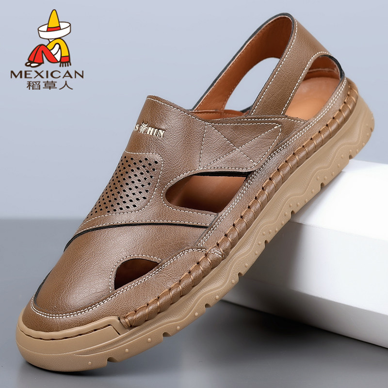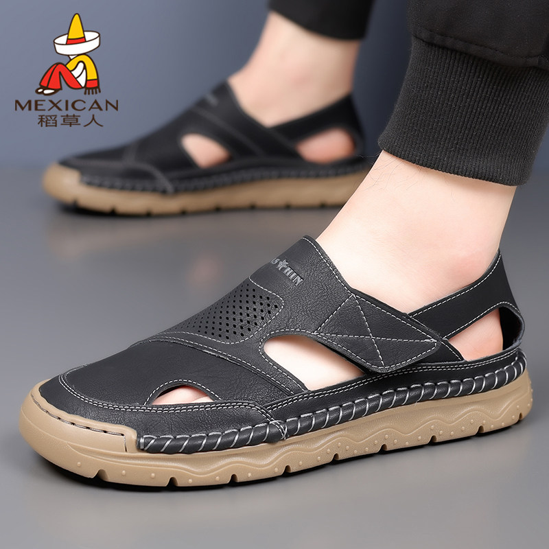 稻草人凉鞋男夏季透气包头外穿洞洞沙滩鞋镂空真皮新款男士皮凉鞋