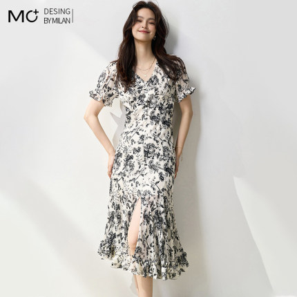 2025夏季新款水墨画复古气质开叉鱼尾裙V领收腰垂坠感过膝连衣裙