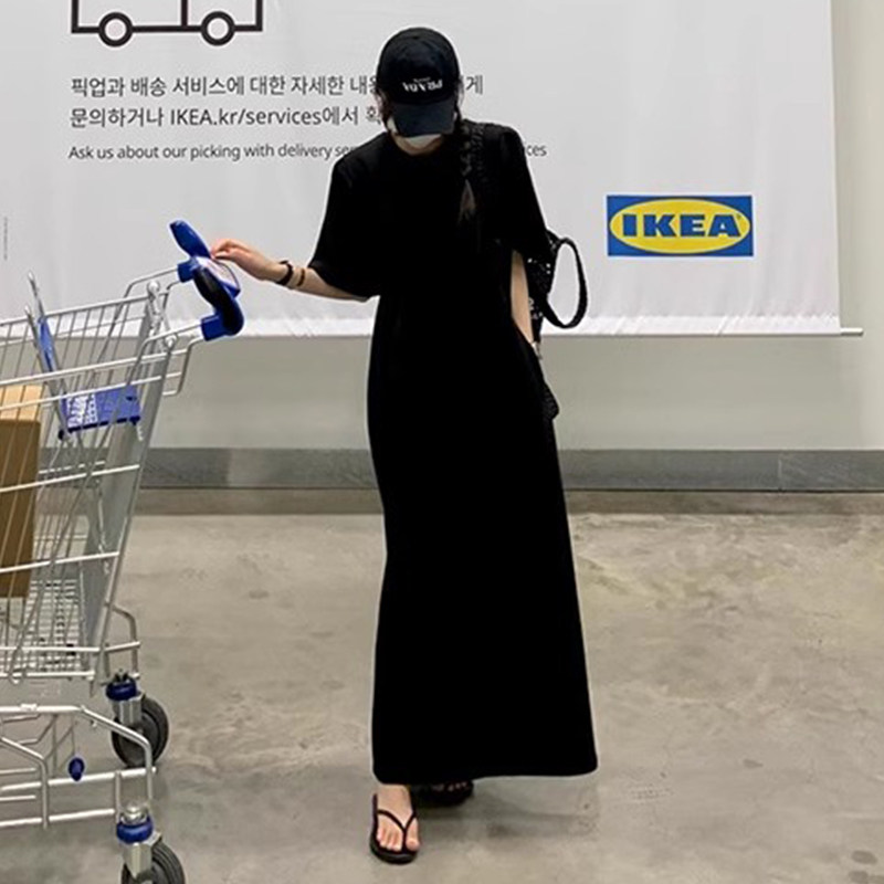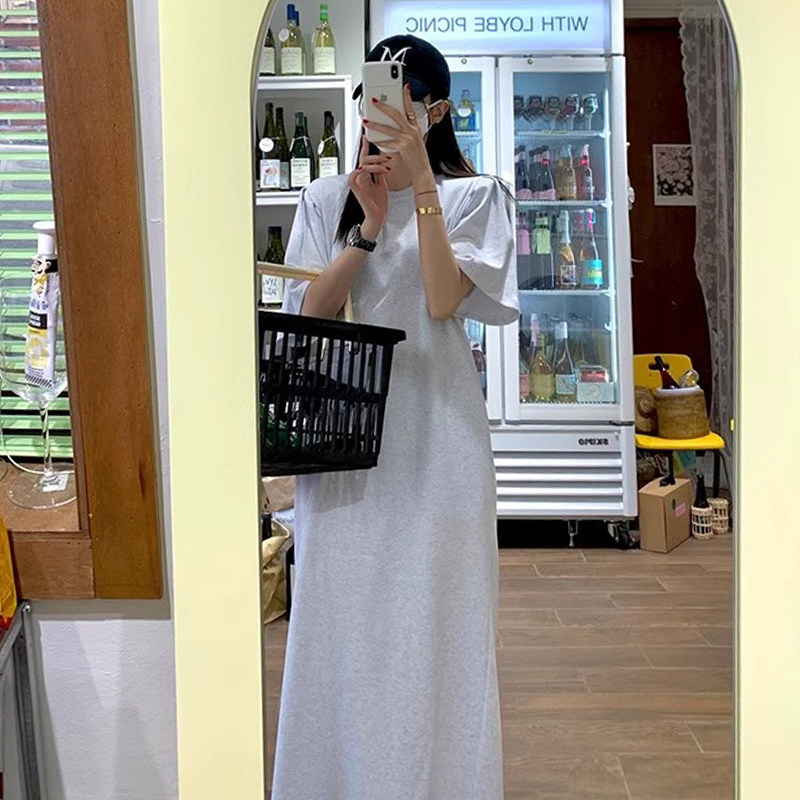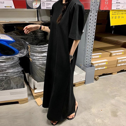 韩国chic夏季复古慵懒风圆领宽松休闲后开叉长款短袖T恤连衣裙女