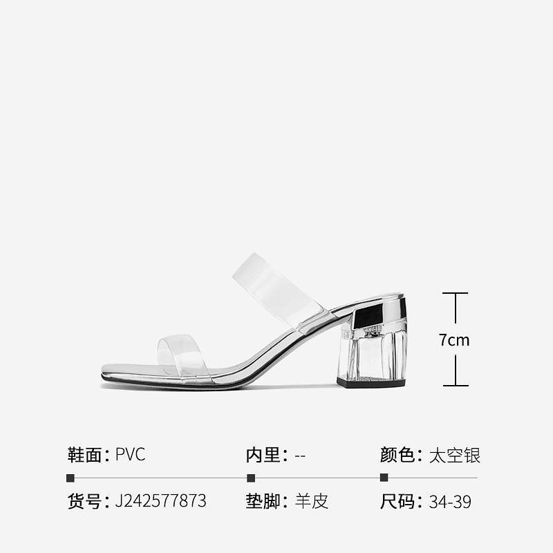 JOOC玖诗方头凉拖鞋2025夏季新款法式透明一字带高跟凉鞋百搭女鞋