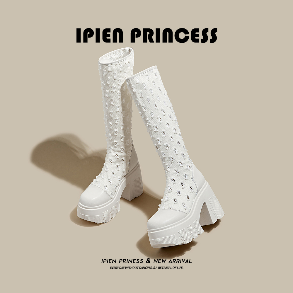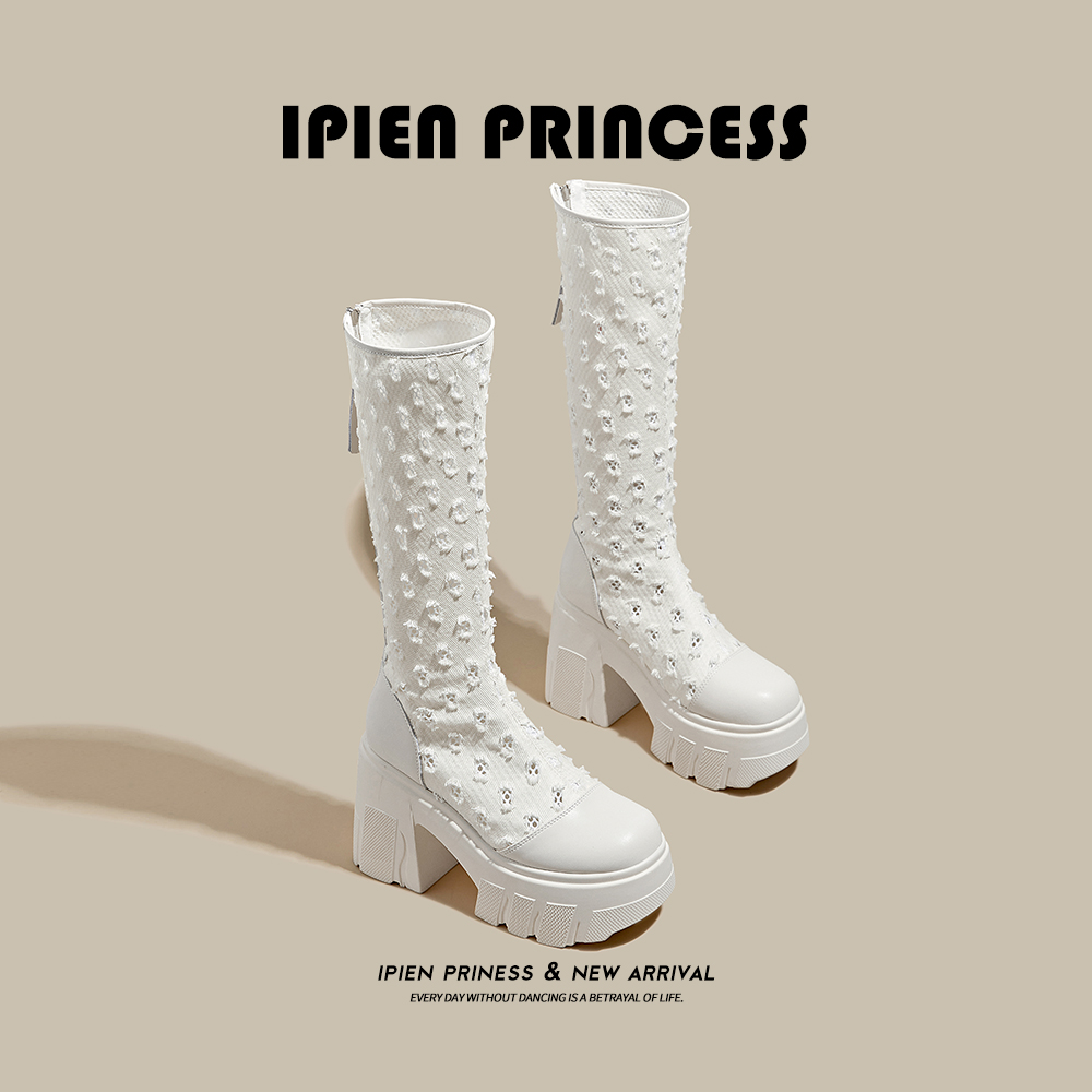 网纱凉靴女2025夏季新款爆款白色镂空长筒靴厚底配裙子高跟马丁靴