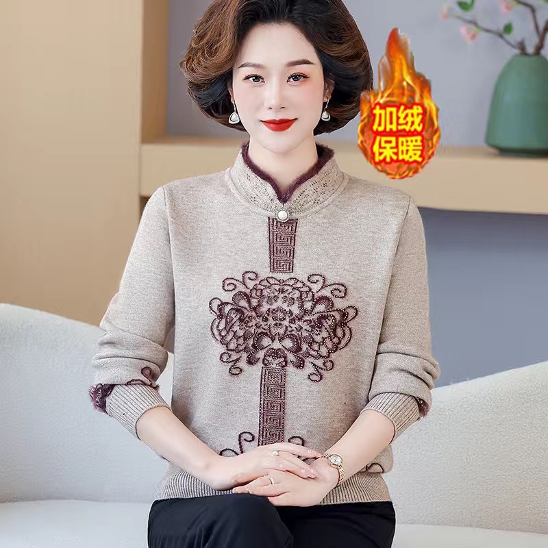 妈妈冬装加绒毛衣一体绒加厚女士针织衫国风中老年女士保暖上衣