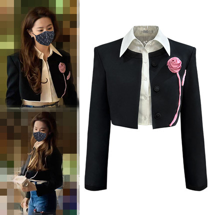 黑色立体花朵外套女短款玫瑰故事黄亦玫同款高级感小西服修身外衣