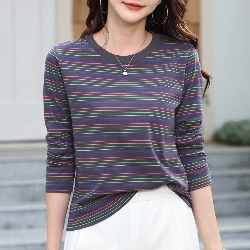 细条纹纯棉长袖t恤女大码宽松胖mm加肥老人秋衣中老年妈妈打底衫