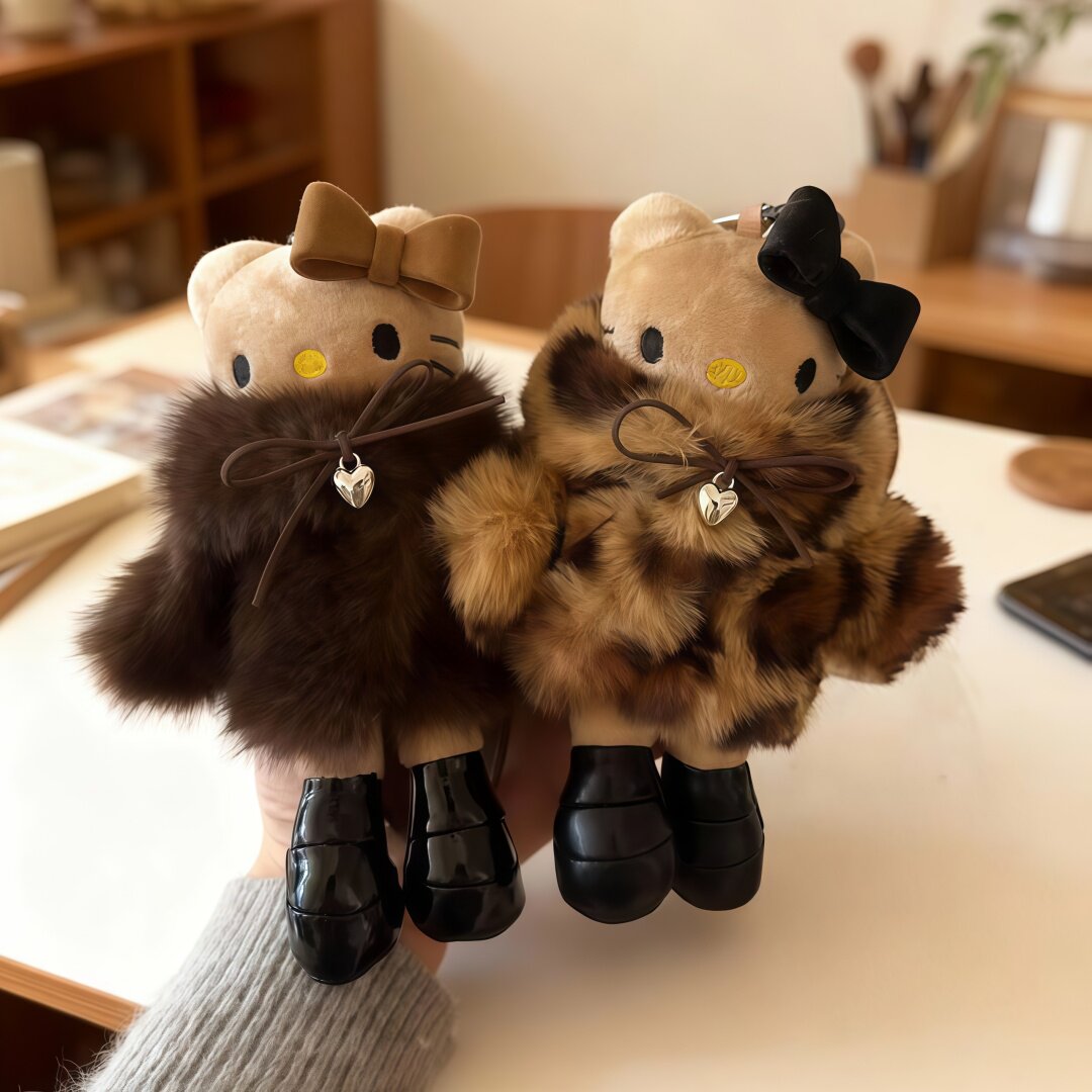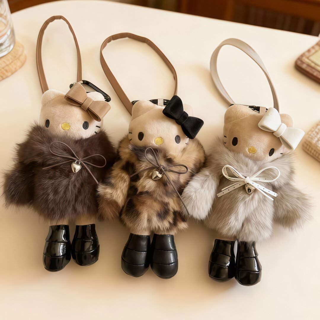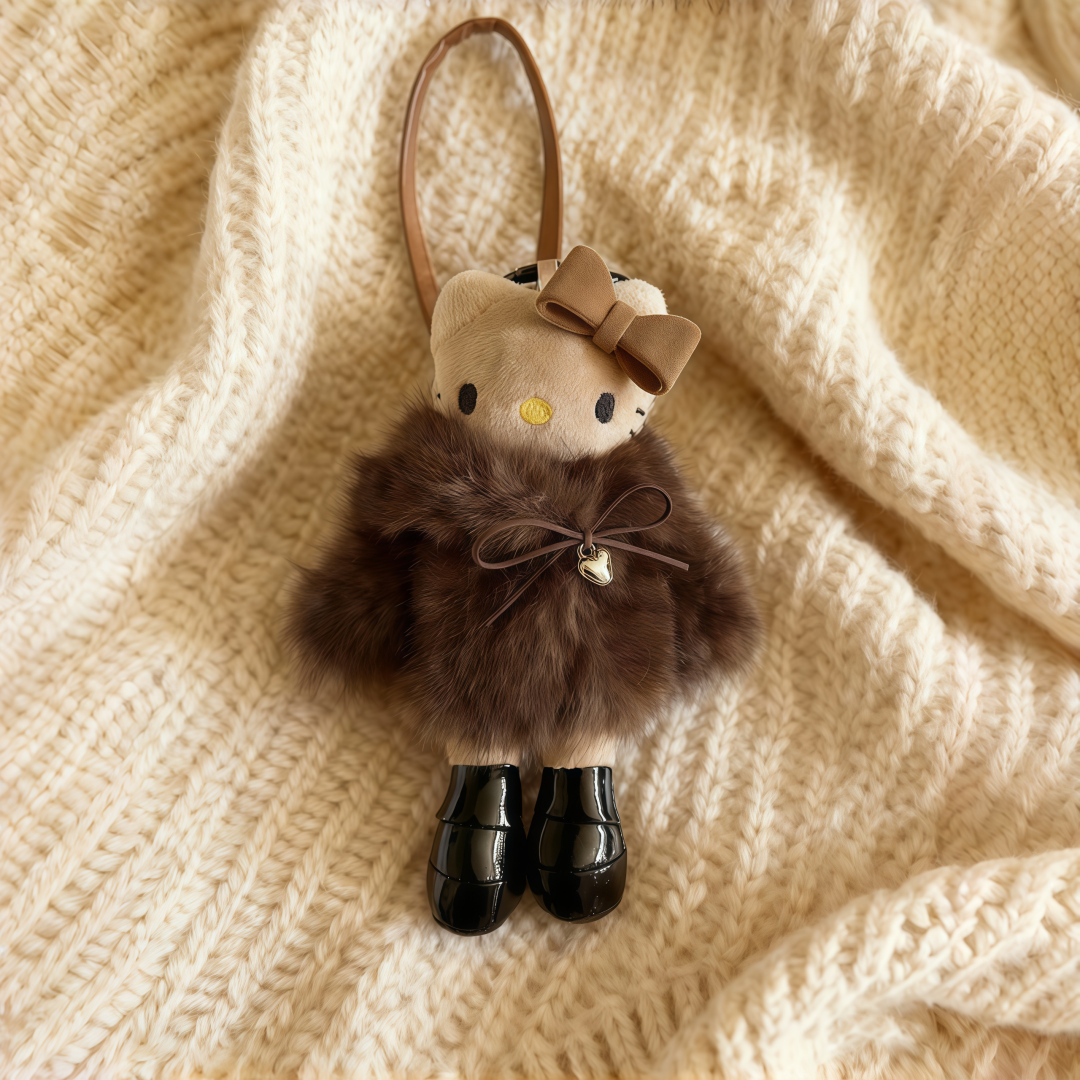 日本PeerEx皮草长腿黑皮kitty包包挂件秋冬棕色系毛绒玩偶钥匙扣
