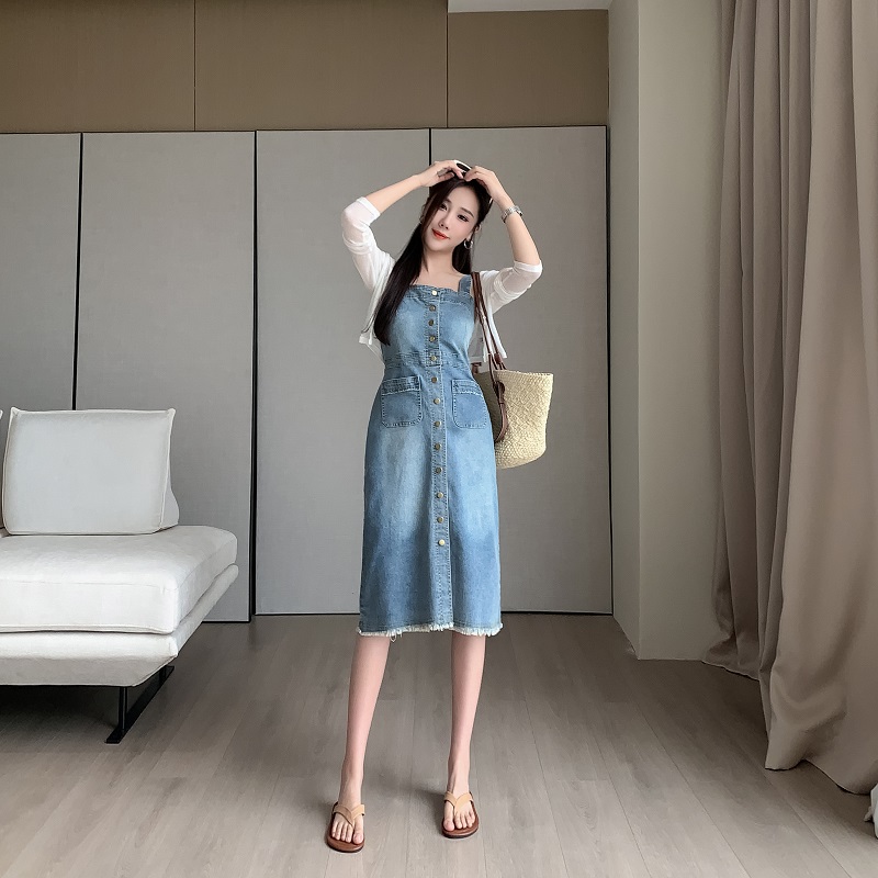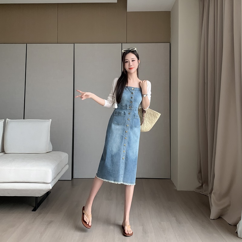 大码微胖复古流苏吊带牛仔连衣裙梨形身材长裙子女夏季显瘦背带裙