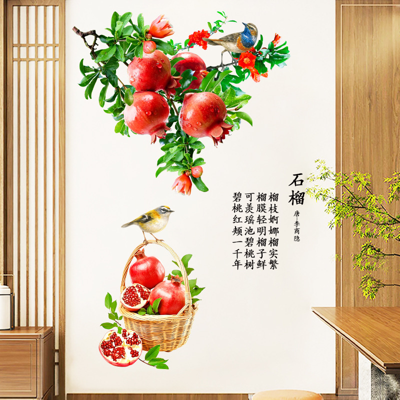 3d立体玄墙面遮丑装饰中式自粘贴画客厅餐厅时来运转石榴喜鹊墙贴