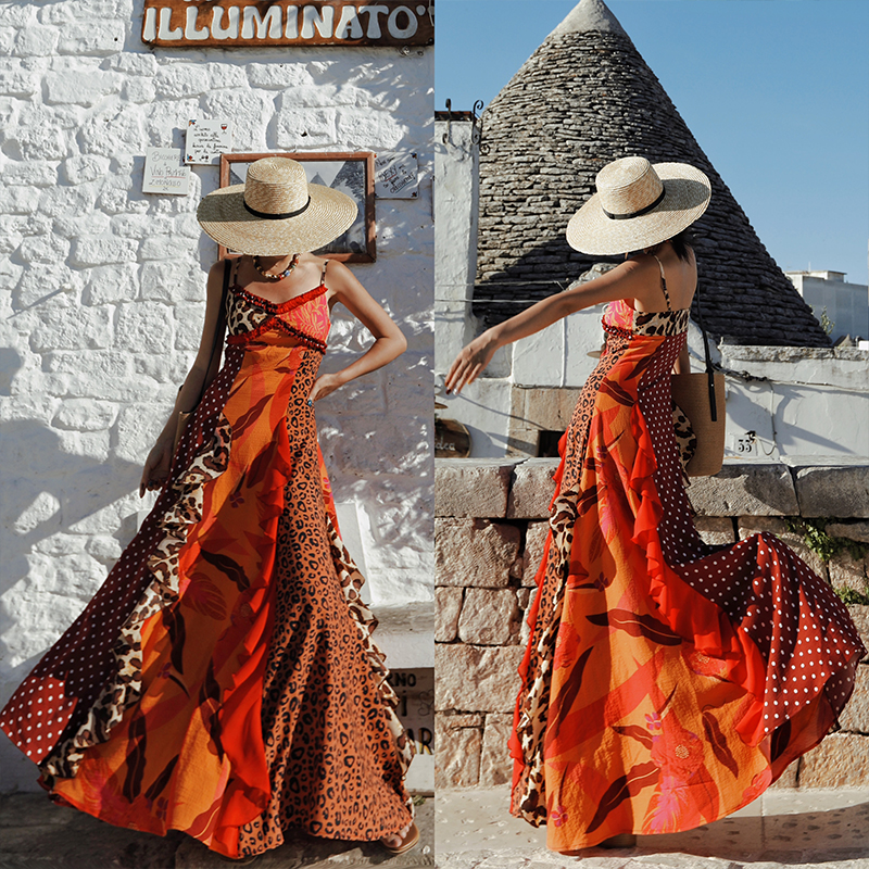 麦叙原创《伊甸花火》法式复古波点豹纹印花拼接荷叶边吊带连衣裙