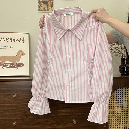 奶油的宇宙 粉条纹收腰polo衬衫长袖女日系甜美显瘦喇叭袖短上衣