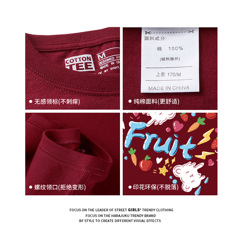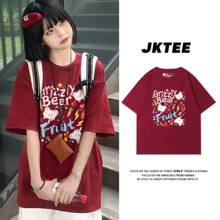 日系学院风原创字母酒红色正肩短袖t恤女宽松中长款显身材体恤夏