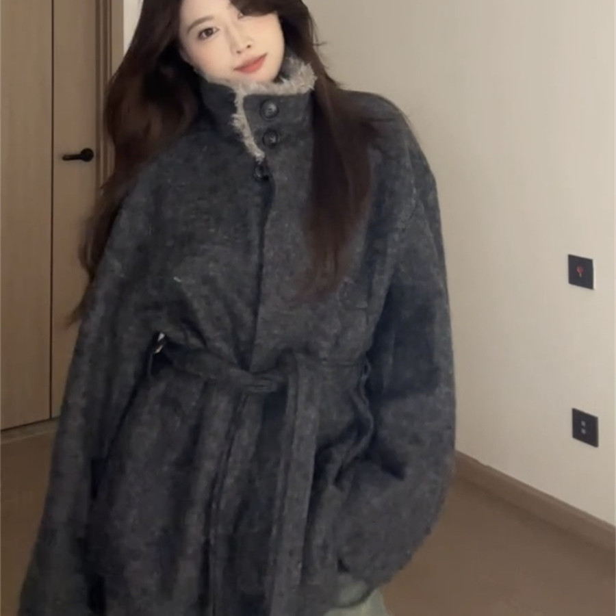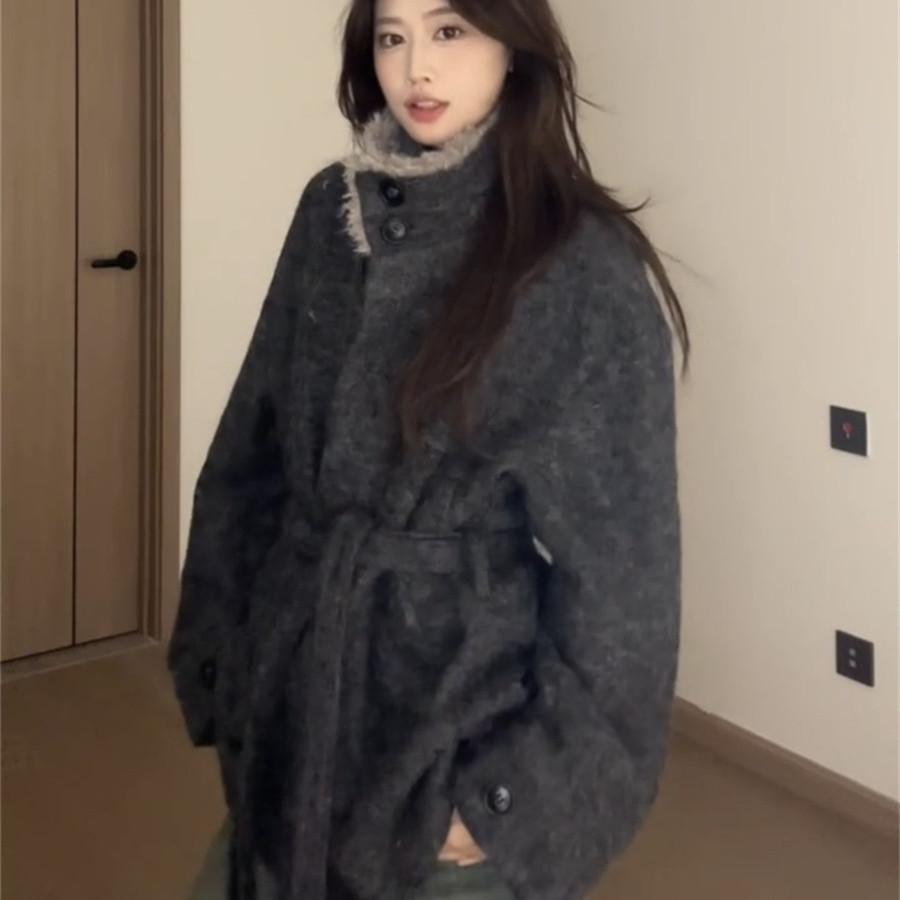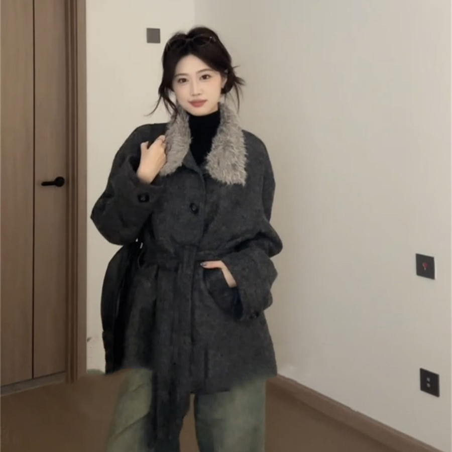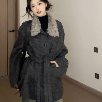 韩系复古灰色毛领呢子大衣女秋冬新款高级感气质系带收腰毛呢外套