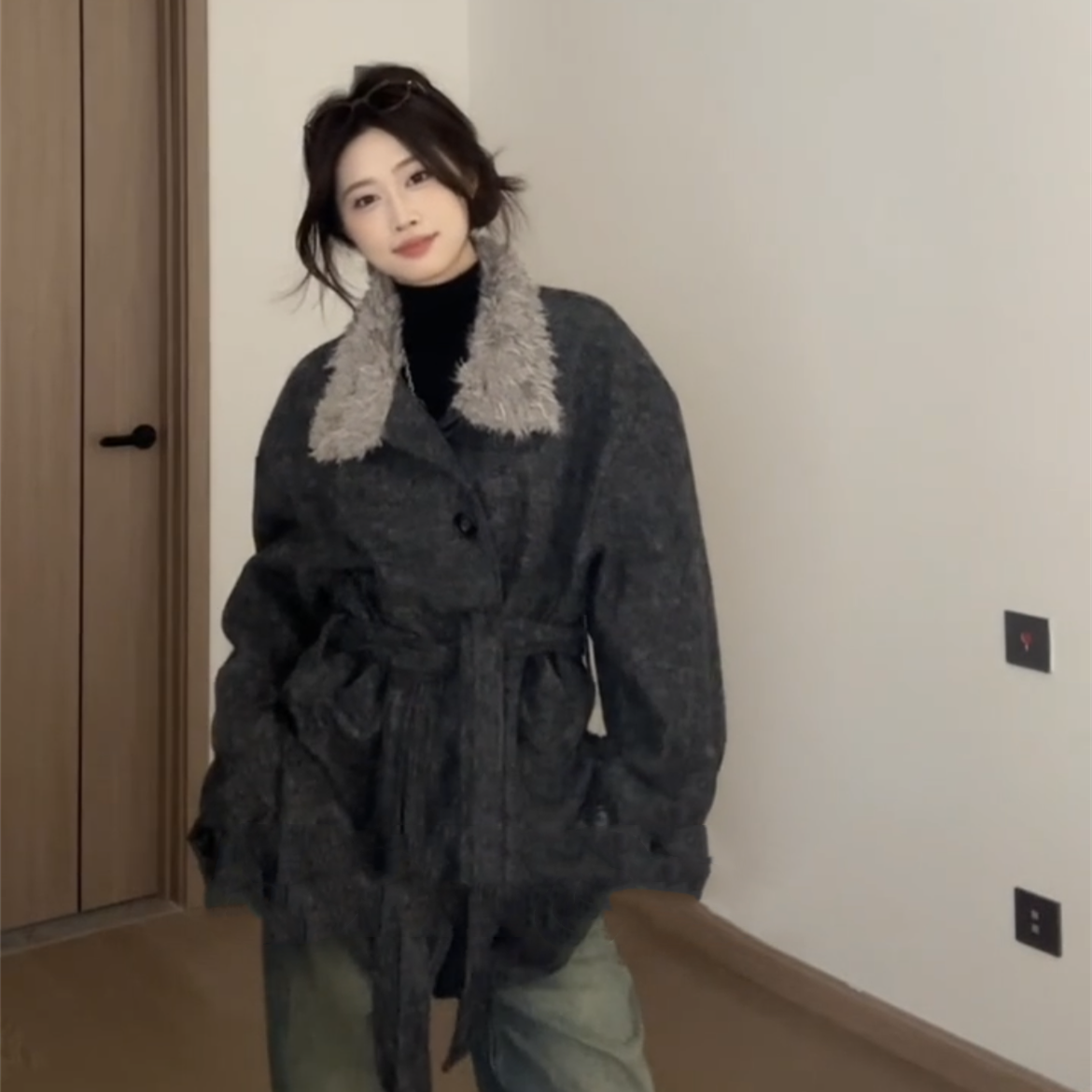 韩系复古高级感灰色毛领呢子大衣