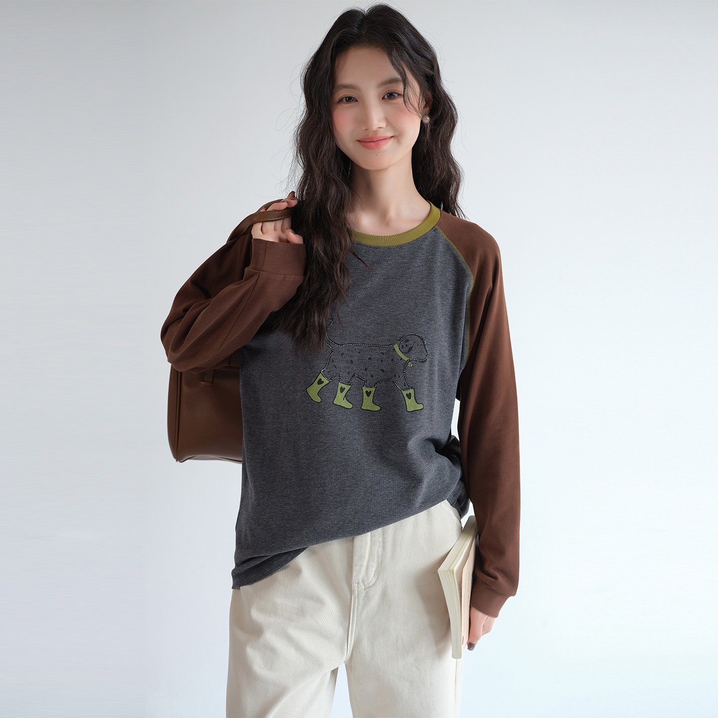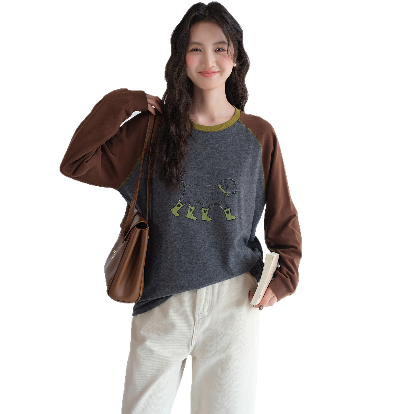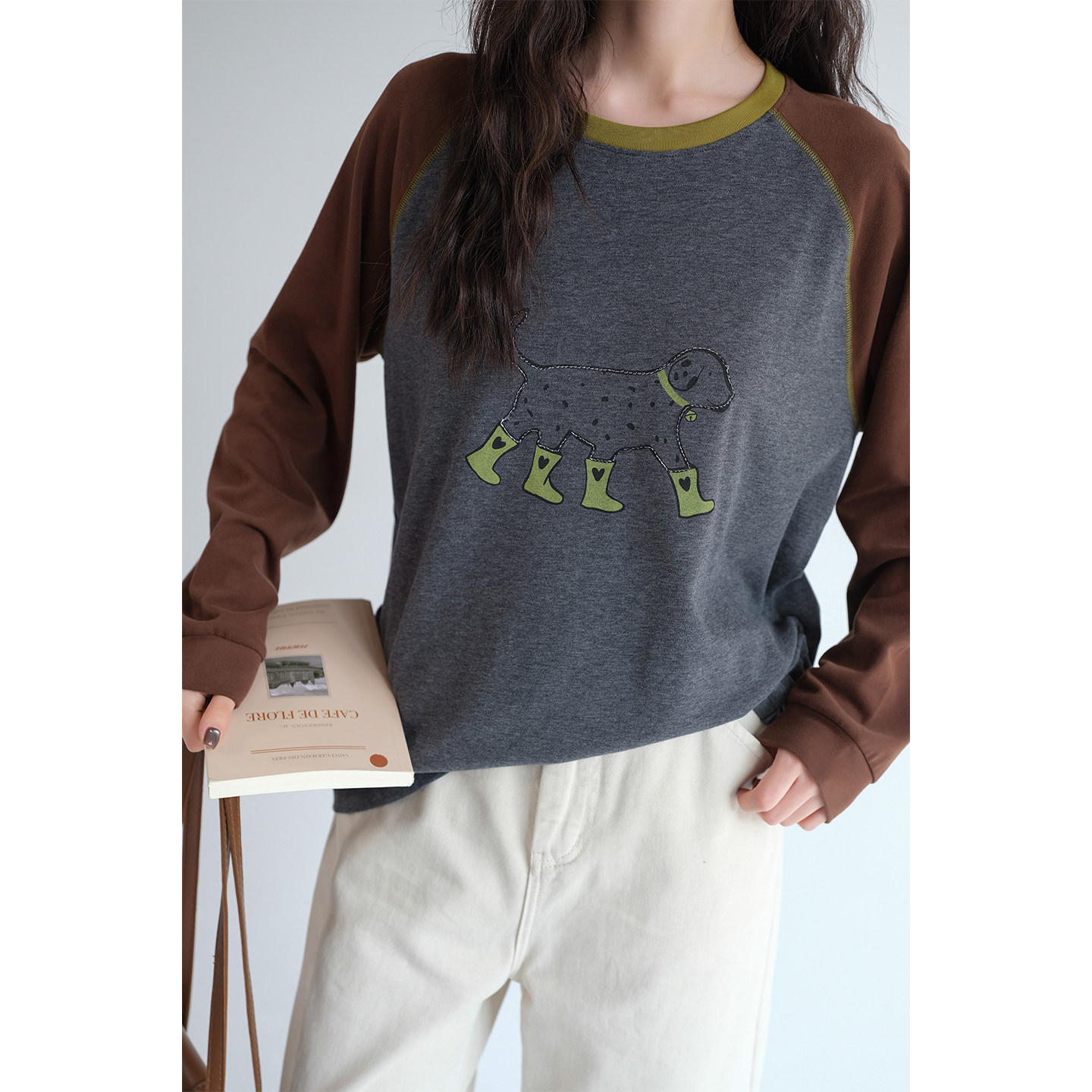 【萌宠印花针织T恤】蓝若水大码2026春装新款复古内搭插肩袖上衣