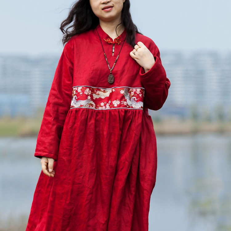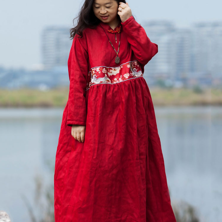 念旧原创/1104A 复古纯亚麻加绒宽松袍子女纯色旅行风加厚连衣裙