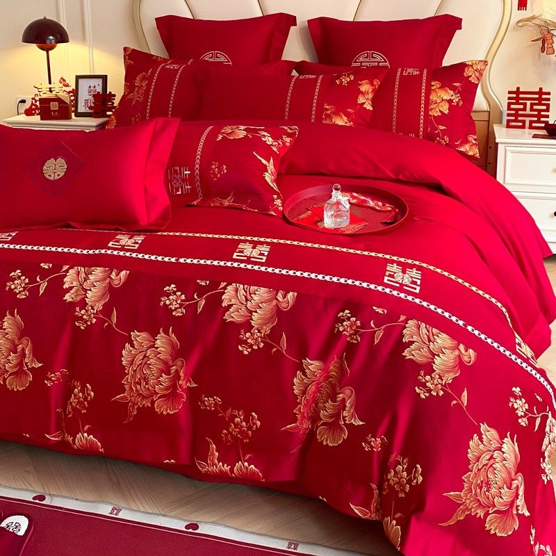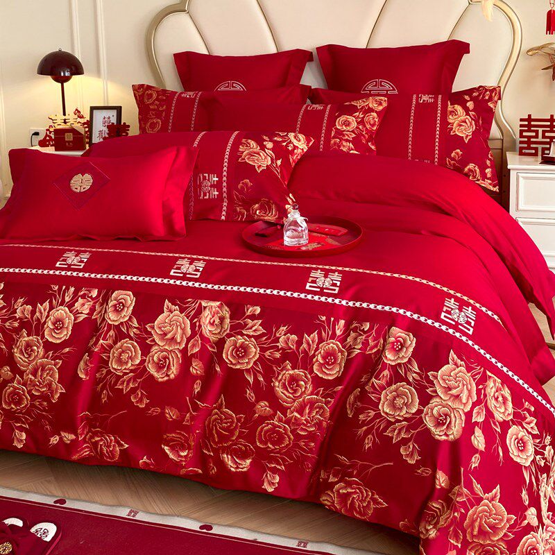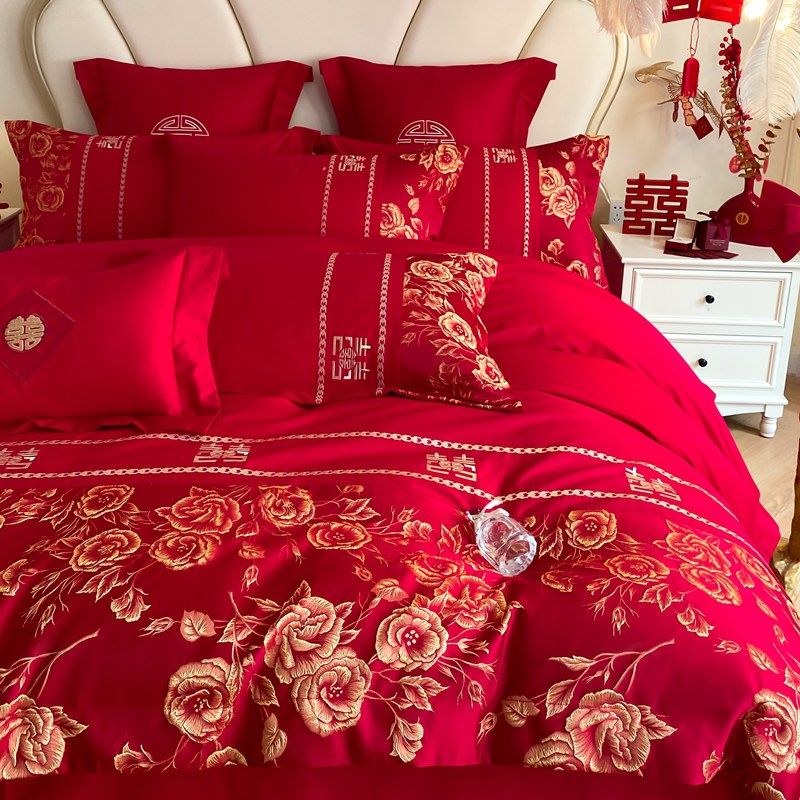 结婚四件套喜庆大红色玫瑰刺绣被套床单婚庆婚嫁床上用品