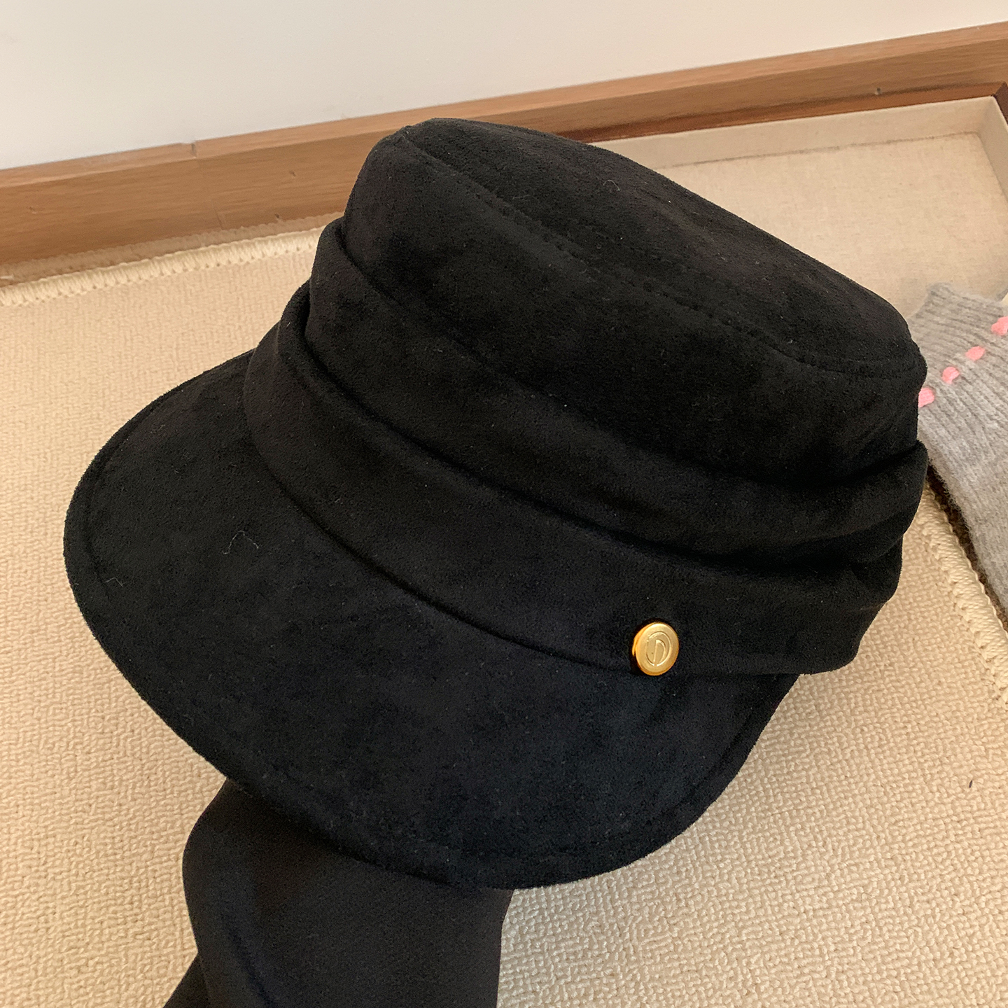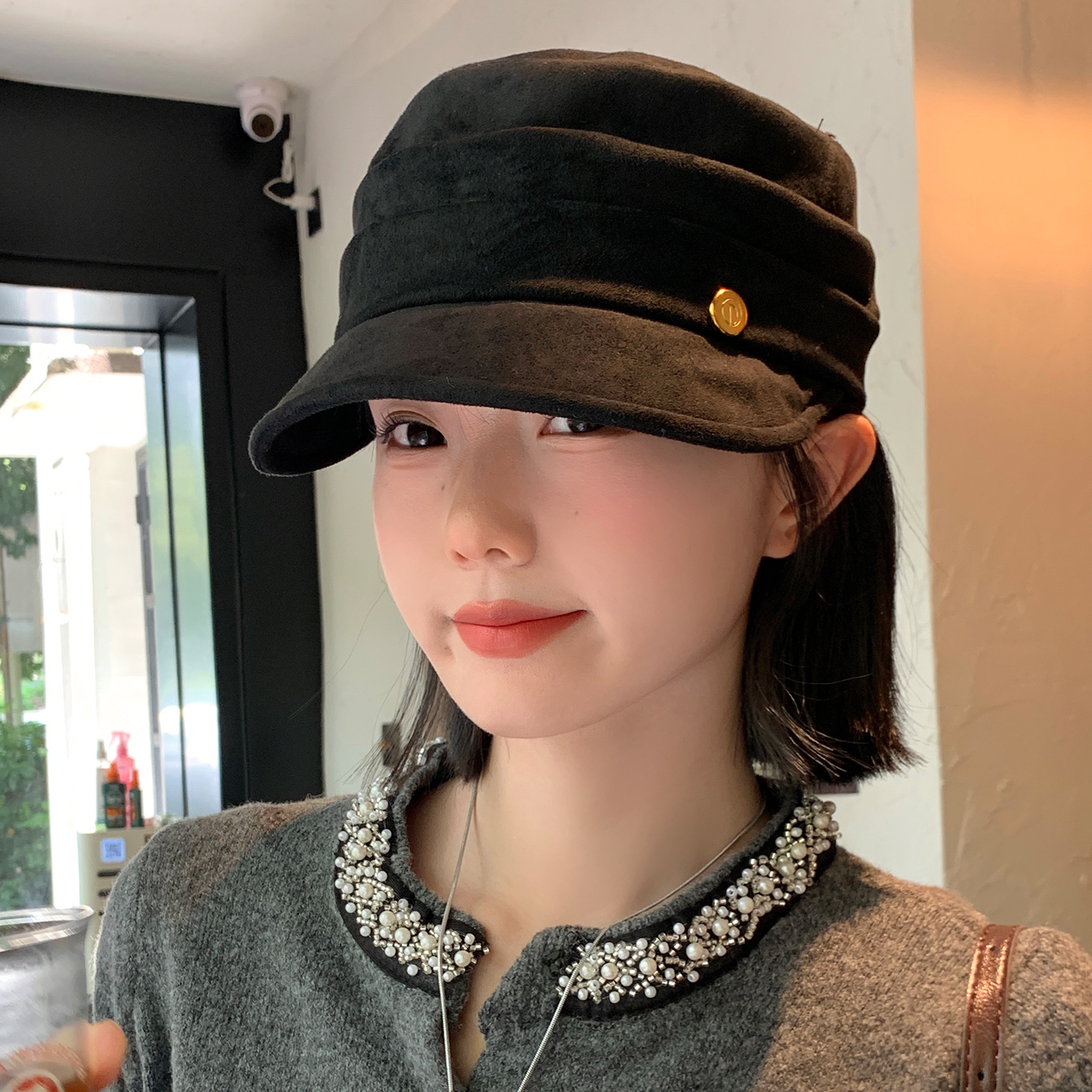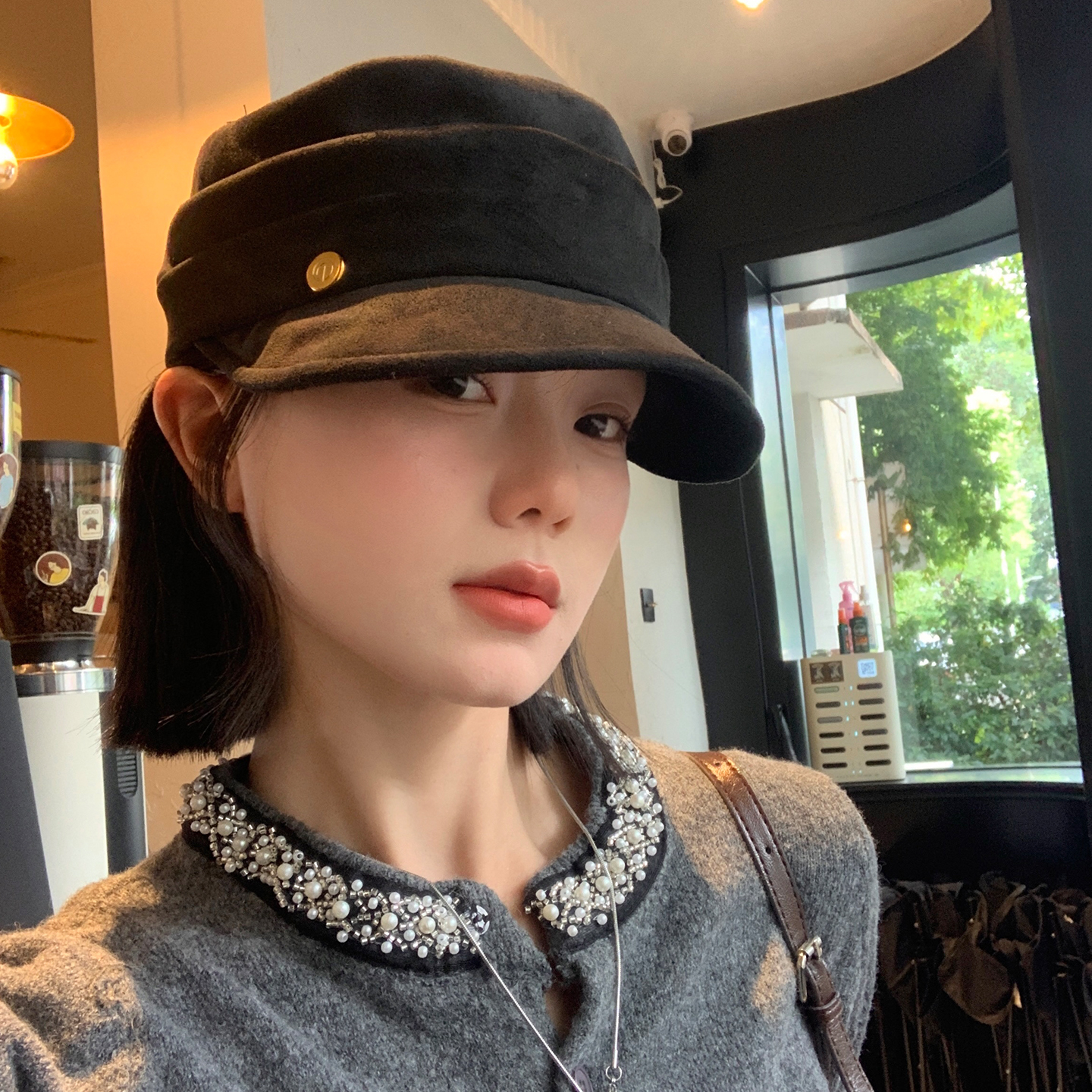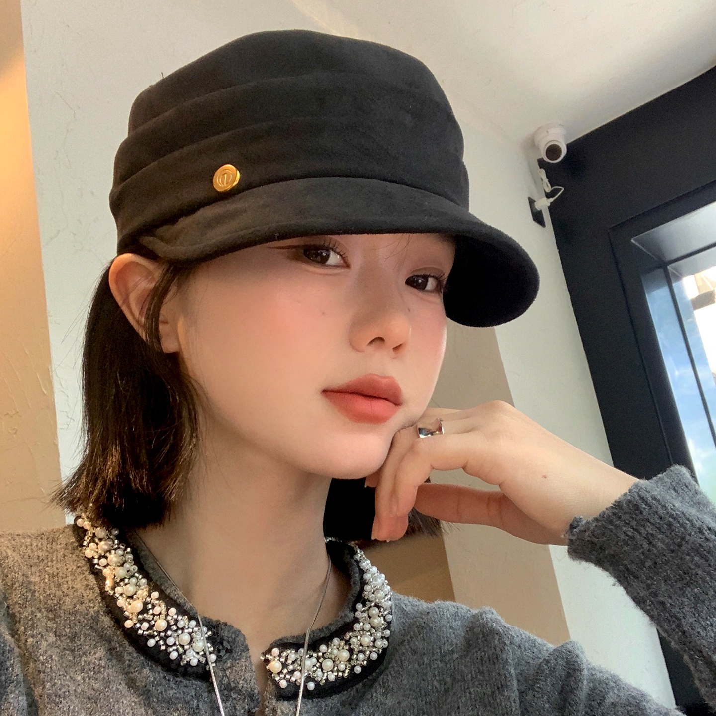 日系黑色麂皮绒平顶马术帽女2025新款秋冬显脸小复古报童贝雷帽子