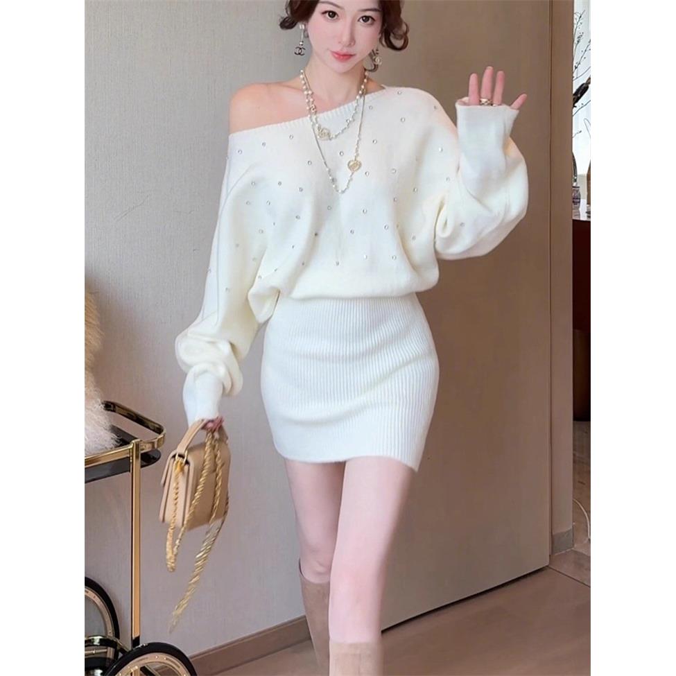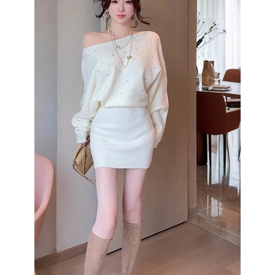 小香风烫钻针织连衣裙女秋冬纯欲性感一字肩包臀裙蝙蝠袖毛衣裙子