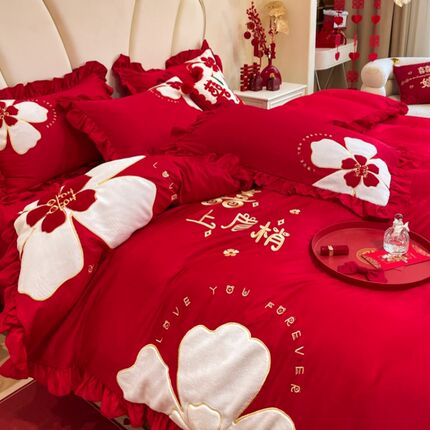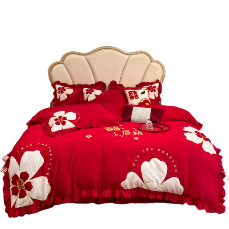 高档中式婚庆四件套全棉大红喜被纯棉刺绣新婚陪嫁礼床单床上用品