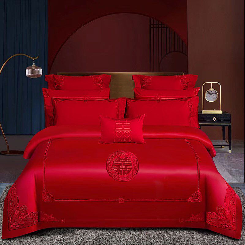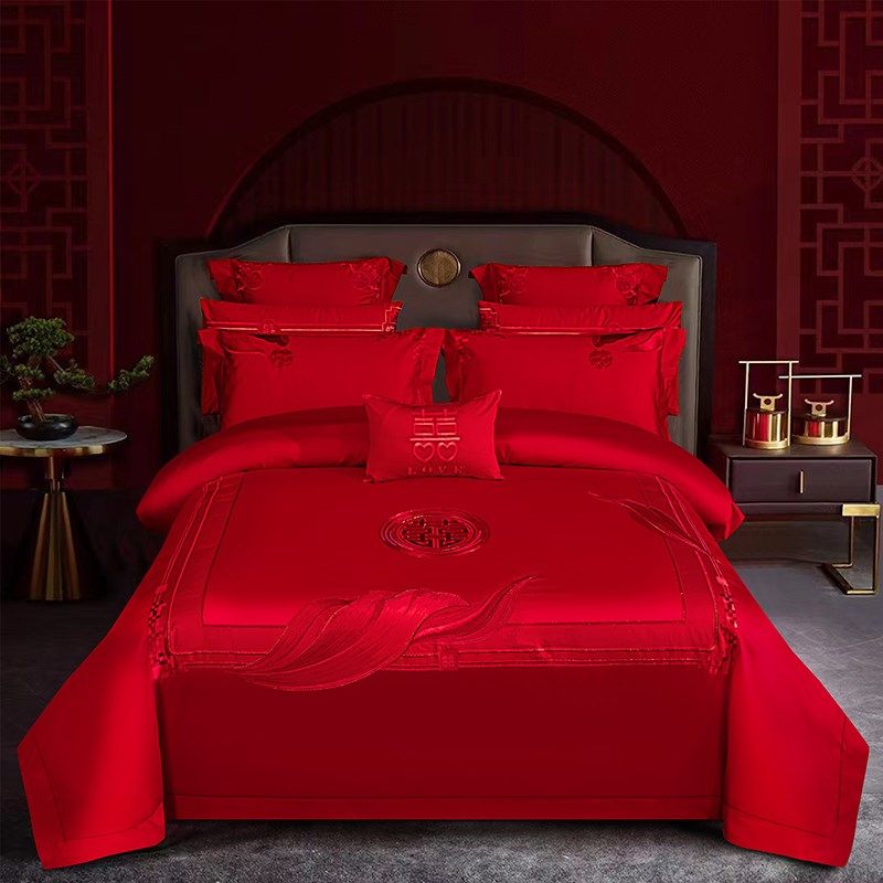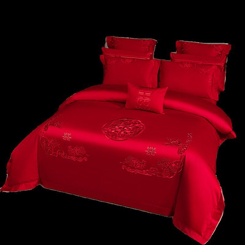 新婚被喜庆被套床单四件套大红色全棉纯棉刺绣囍R字结婚庆婚礼床