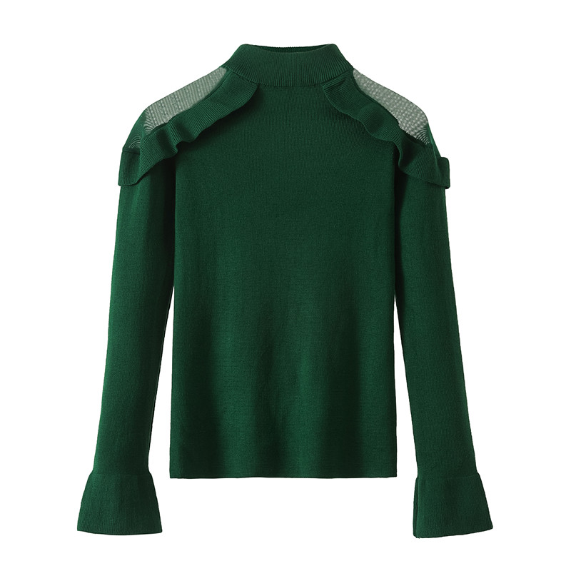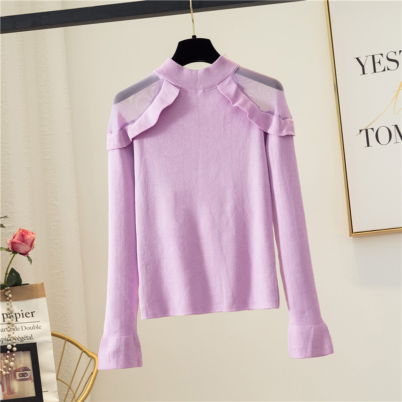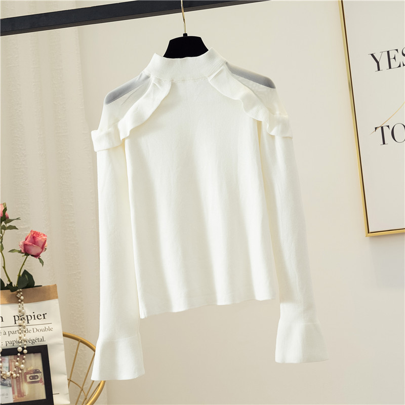 韩版甜美荷叶边网纱露肩长袖针织衫女半高领套头毛衣修身打底衫冬