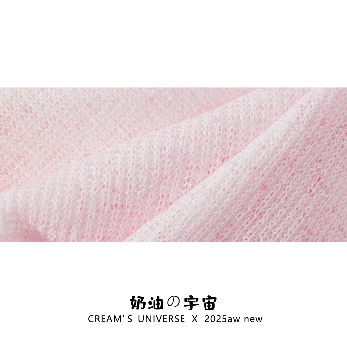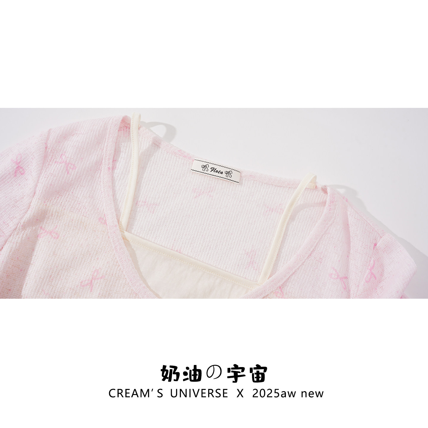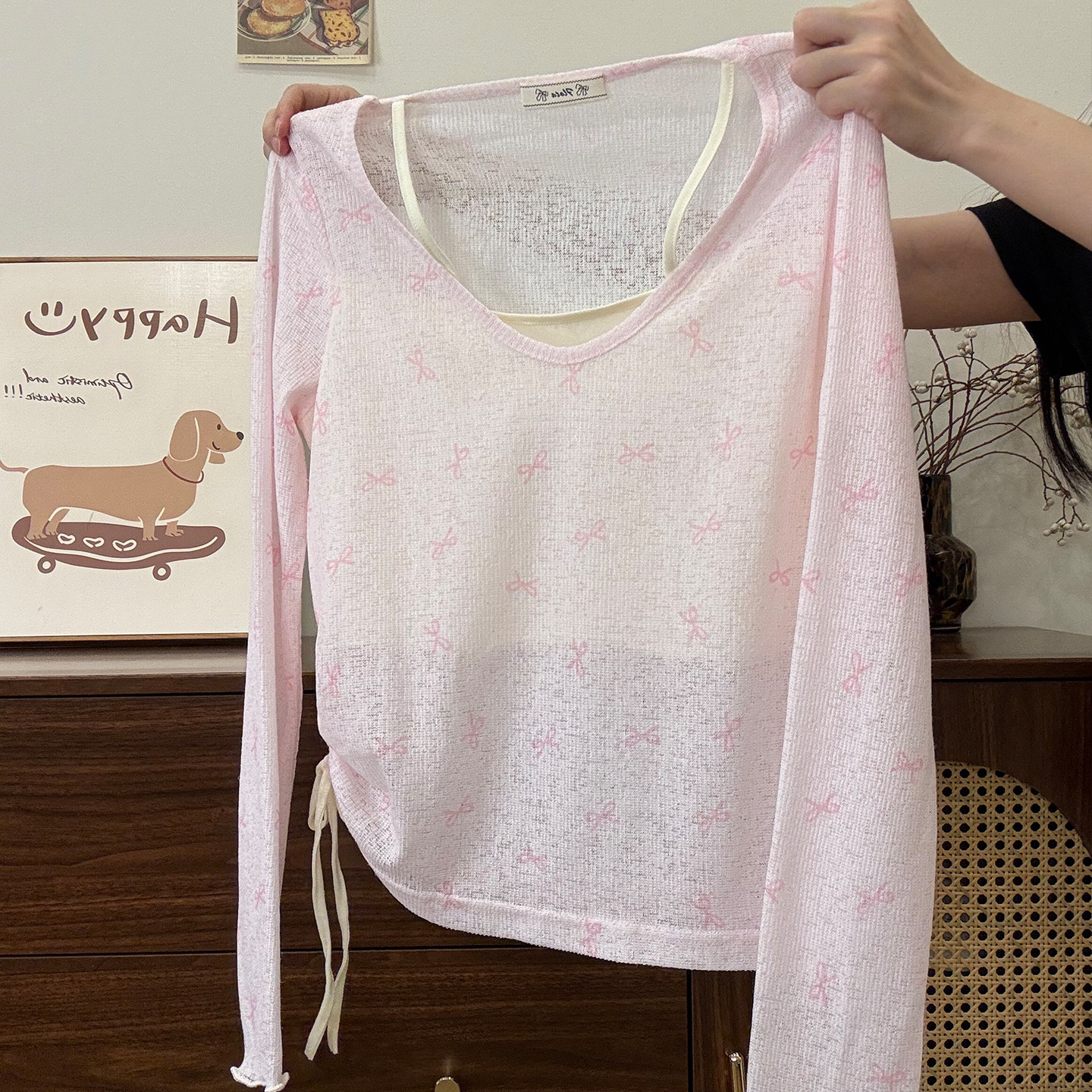 奶油的宇宙 满印蝴蝶结吊带假两件长袖T恤女小清新风绑带薄款罩衫