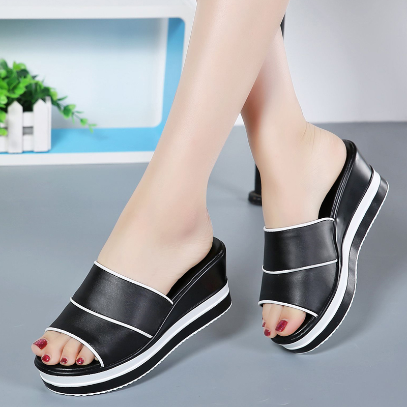 2022凉拖鞋女夏季外穿真皮坡跟一字拖高跟防水台防滑女凉鞋百搭