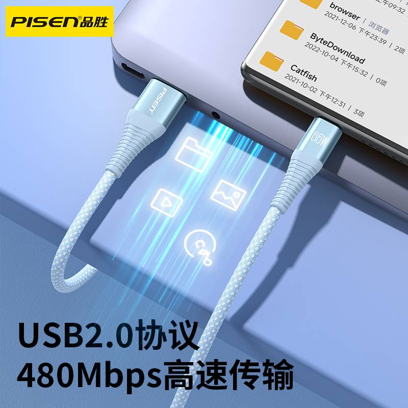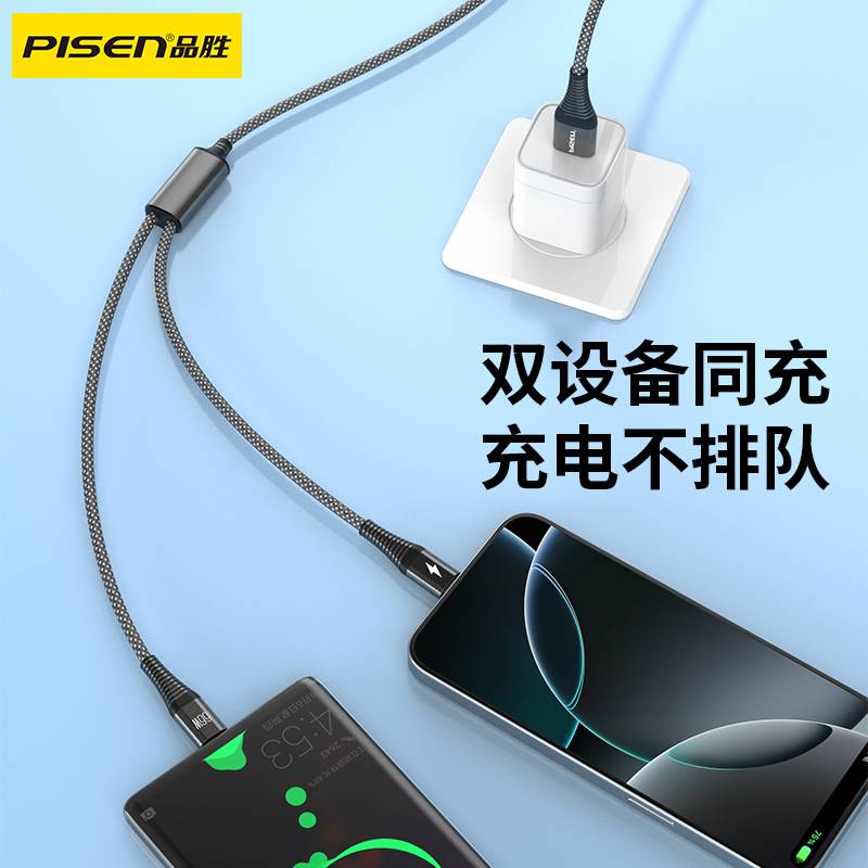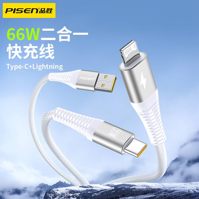 品胜二合一数据线usb一拖二66W充电线器iPhone17快充线适用苹果16/15/14华为小米三星安卓手机平板车载充电线