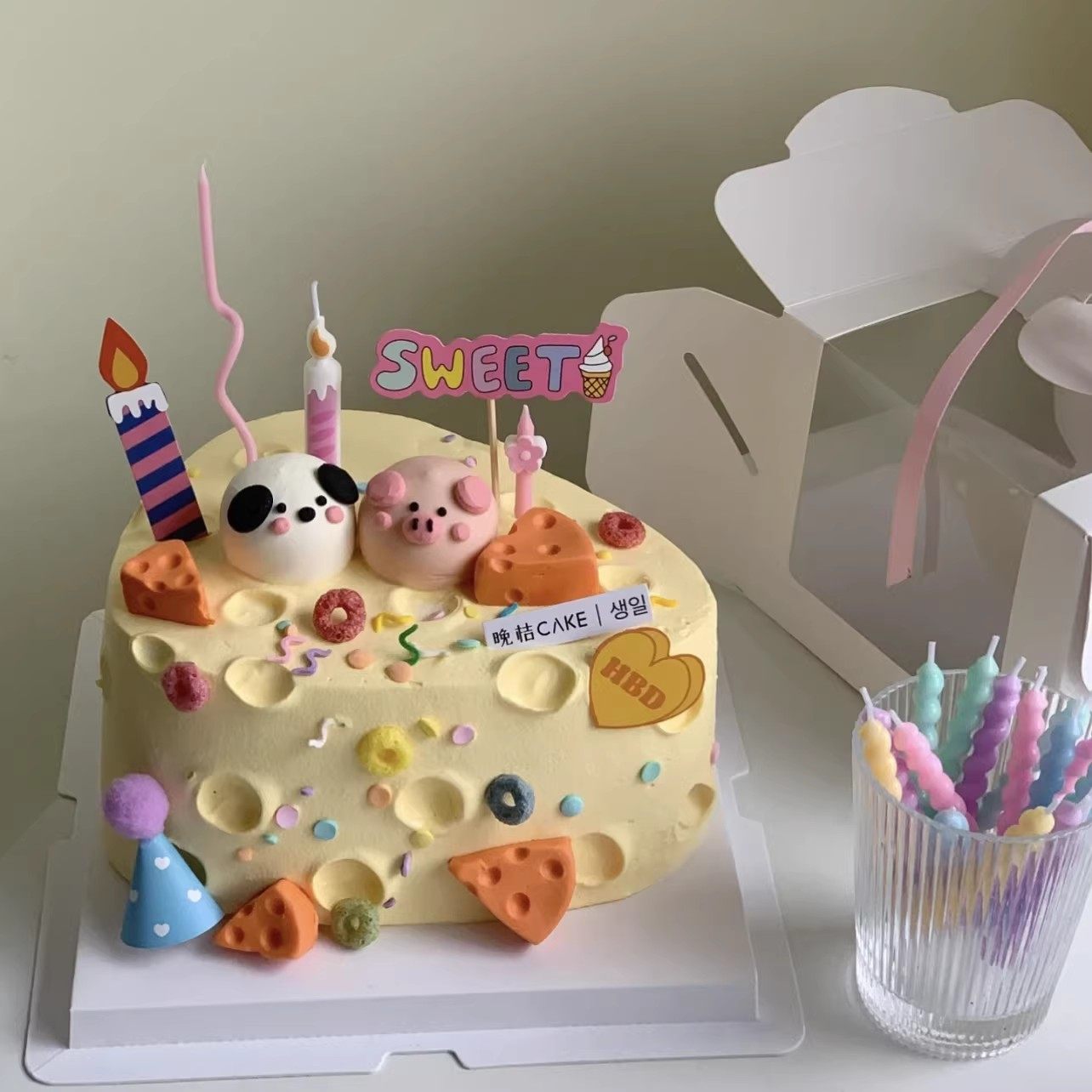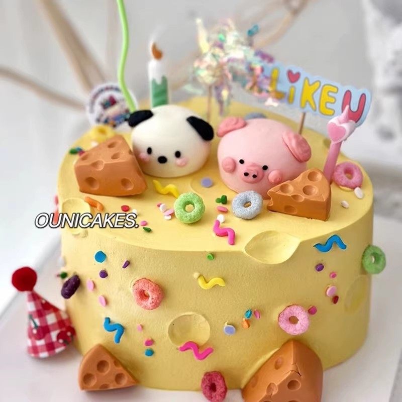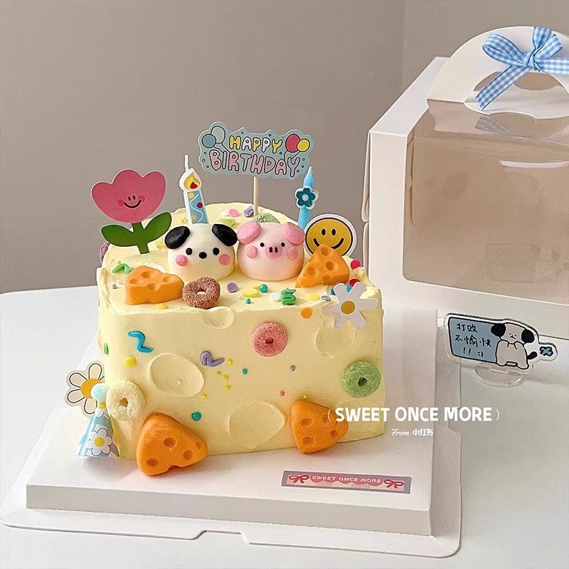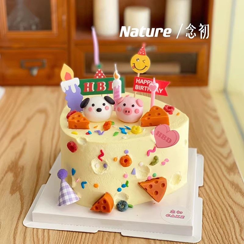 网红奶酪蛋糕装饰品摆件卡通可爱小猪小狗摆件蜡烛HB彩旗插牌插件