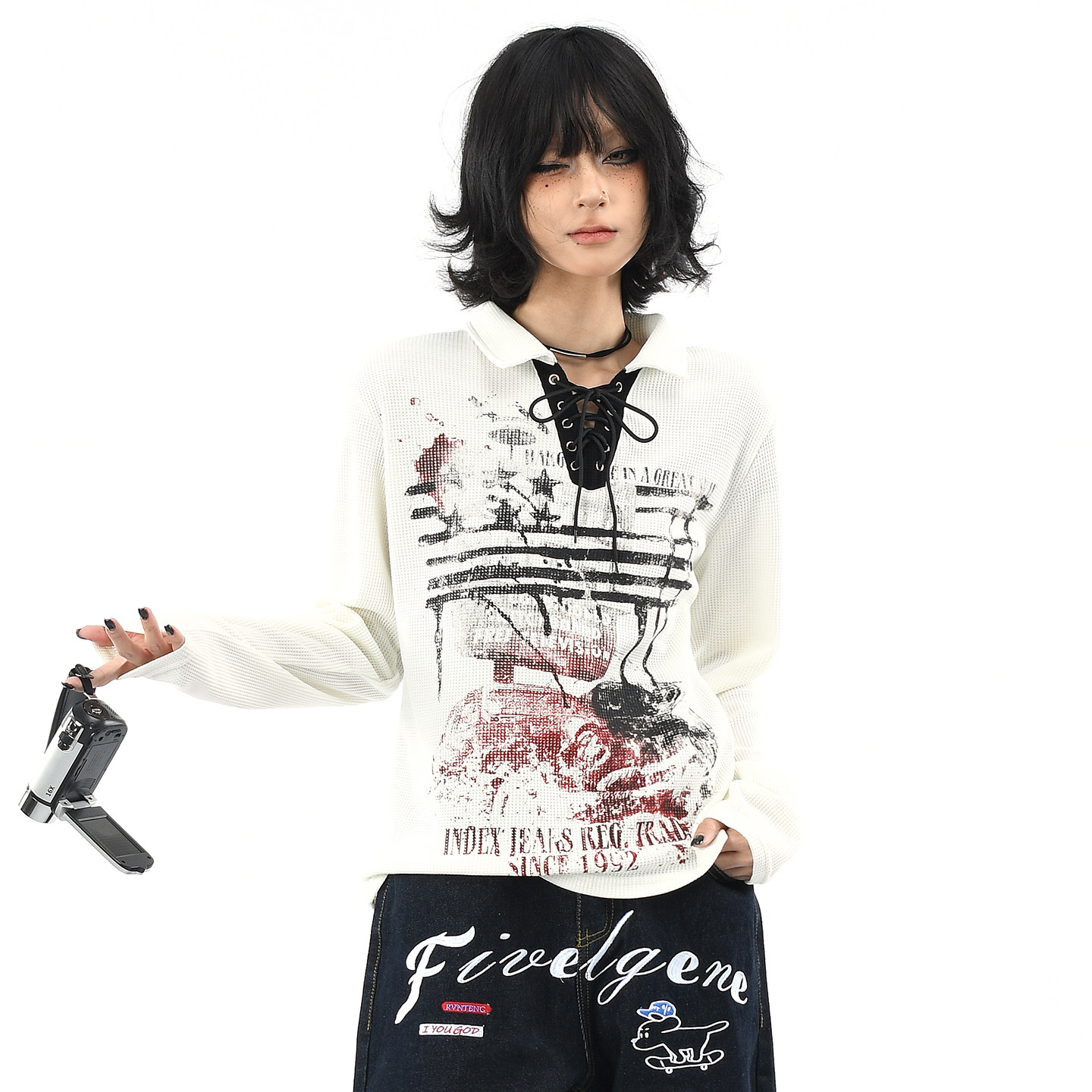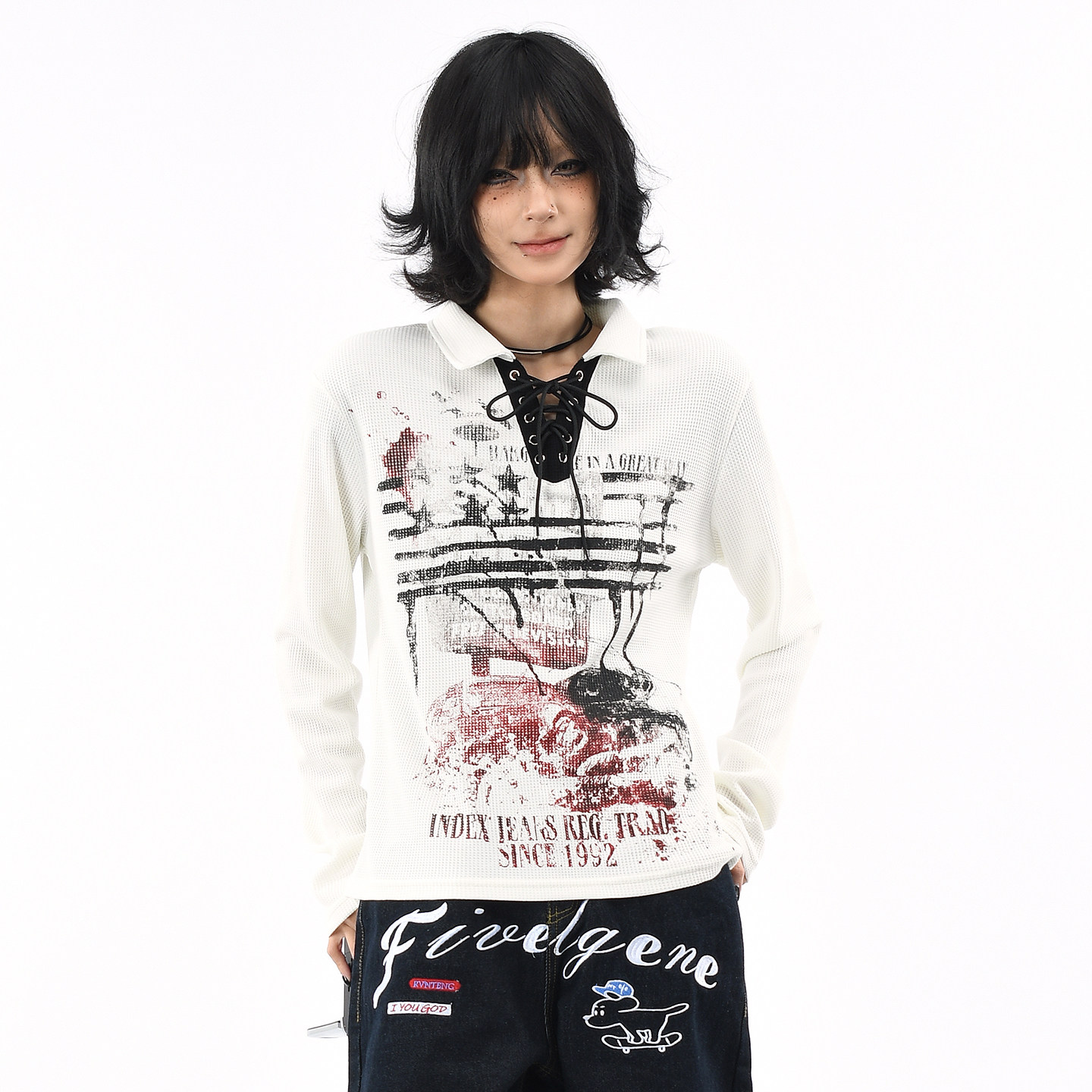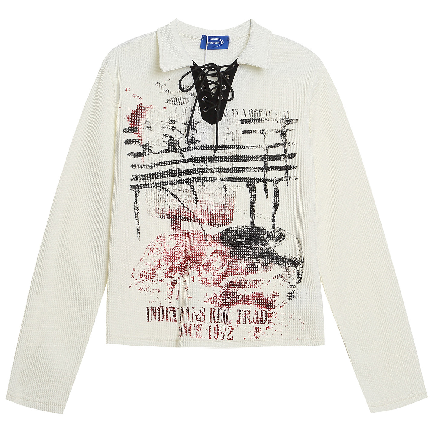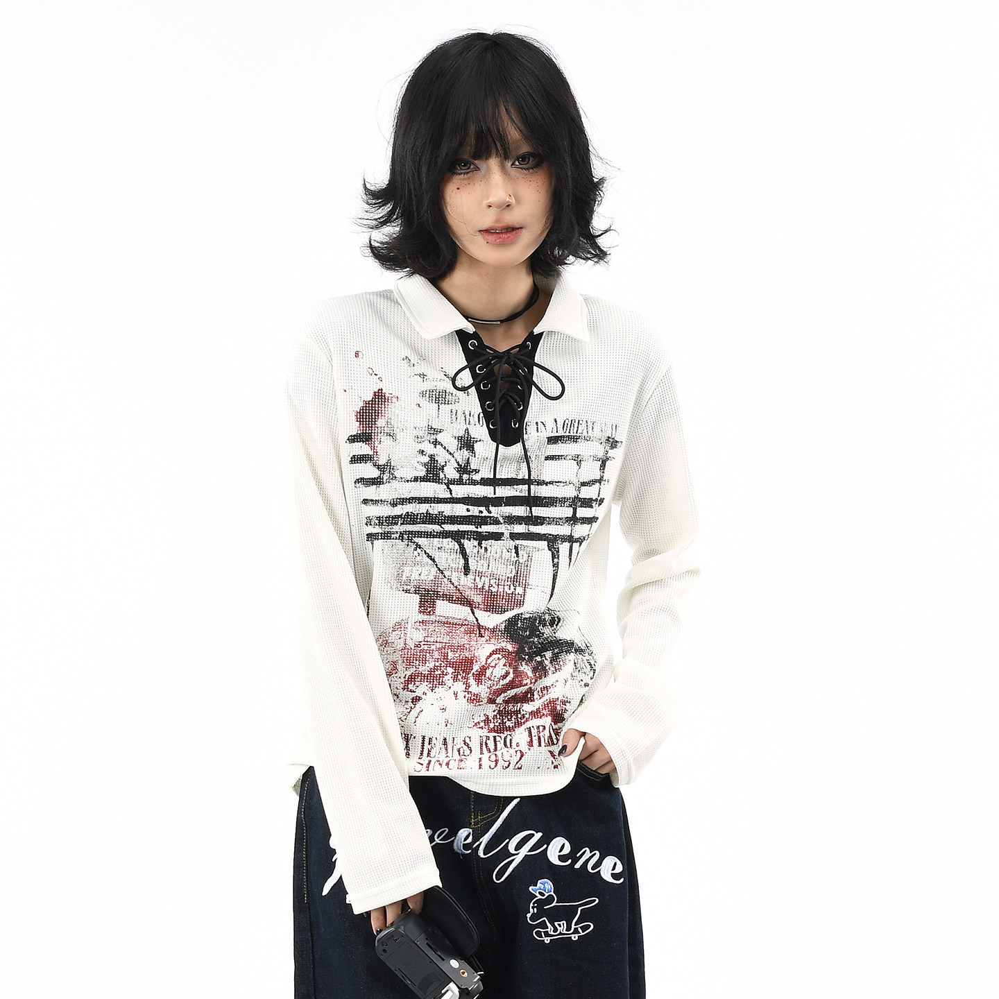 OV原创美式涂鸦绑带V领设计长袖T恤女秋季短款正肩华夫格显瘦上衣