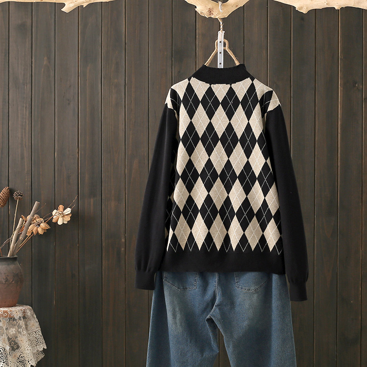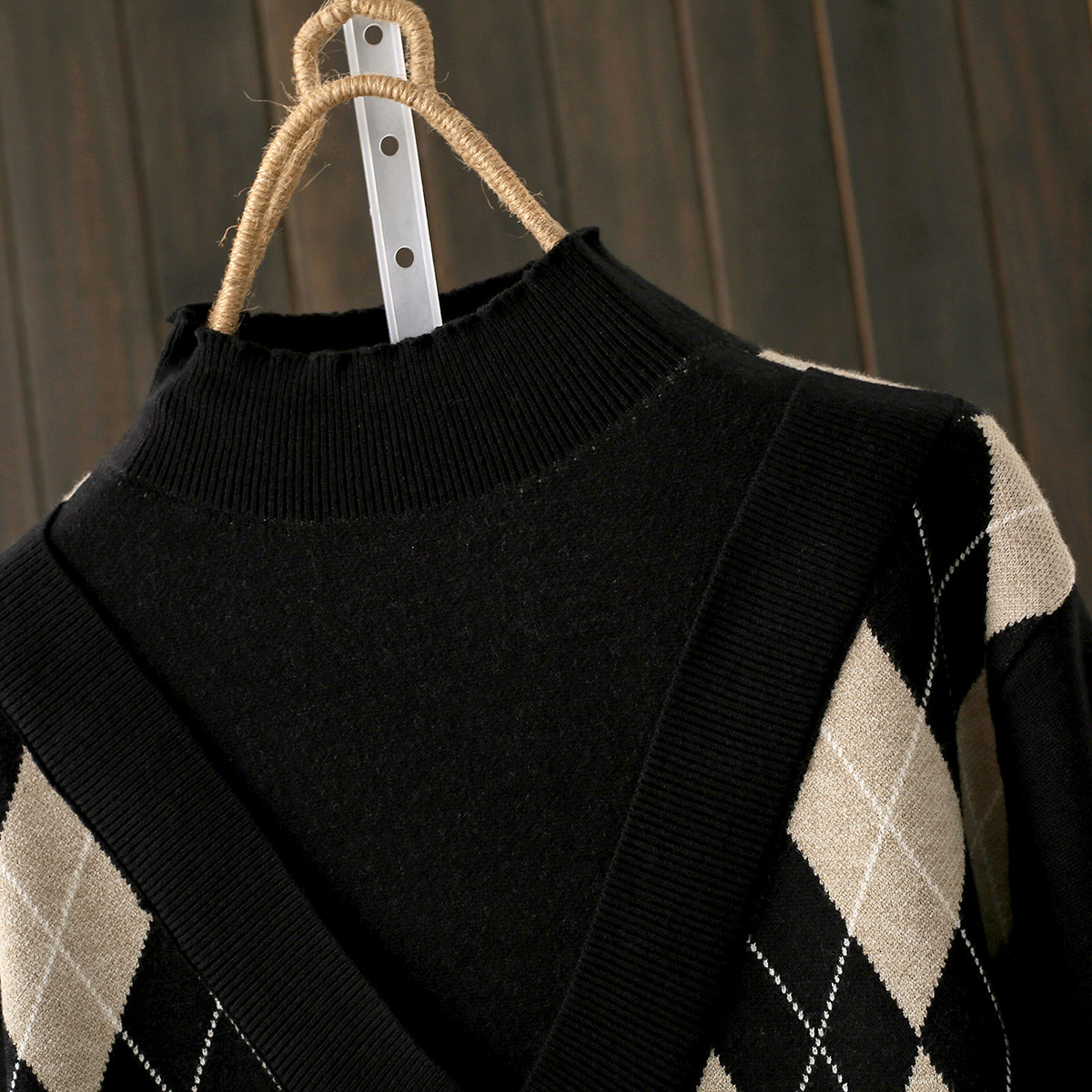 秋冬大码200斤法式复古菱格毛衣女慵懒风宽松半高领假两件针织衫