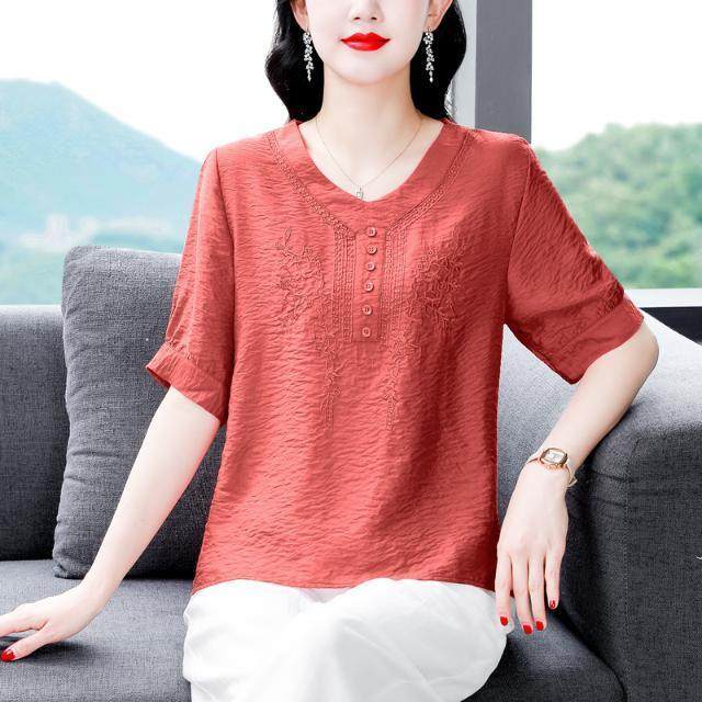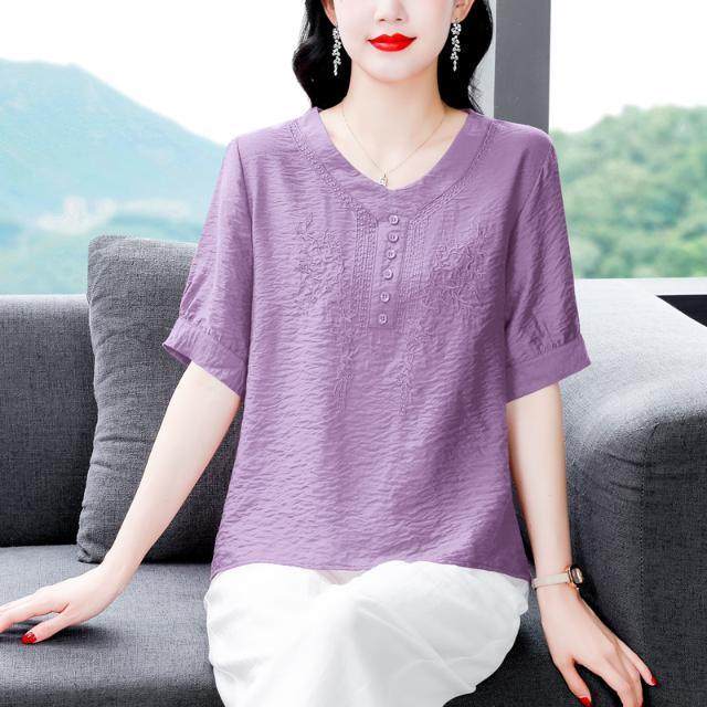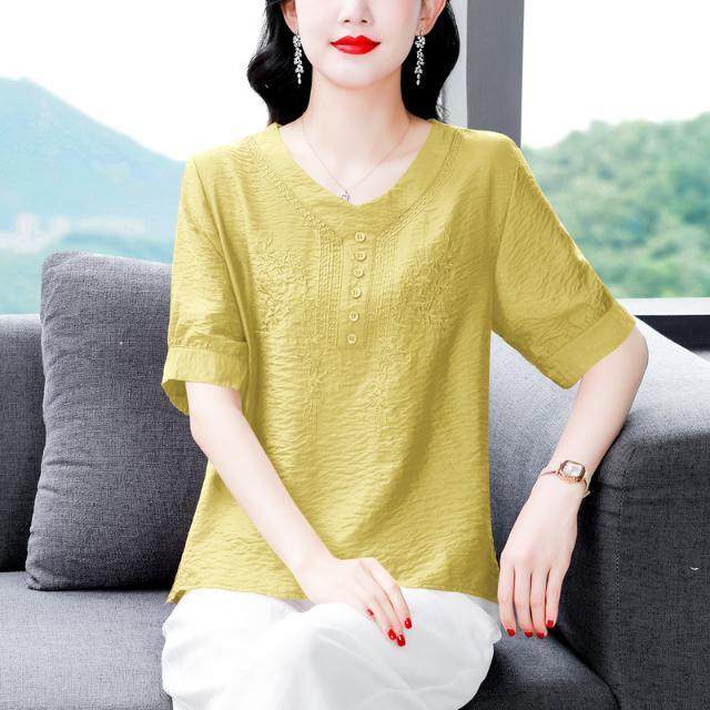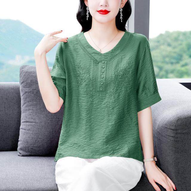刺绣棉麻衬衫女短袖t恤上衣