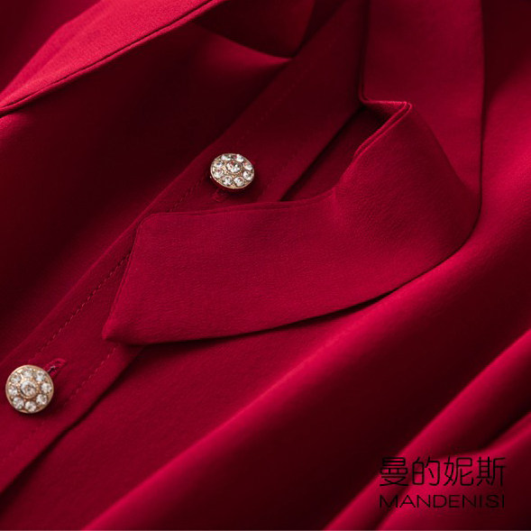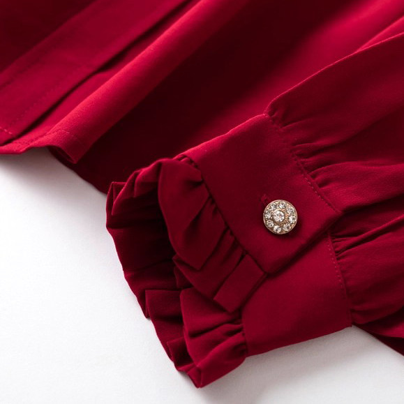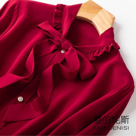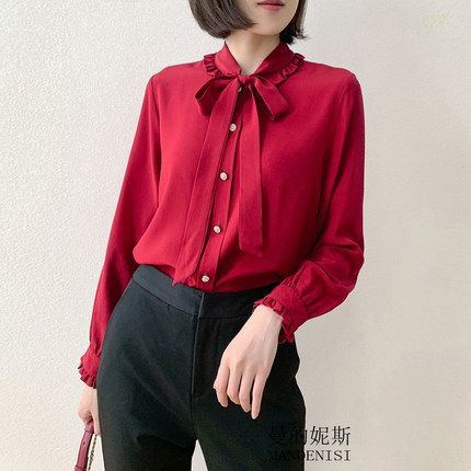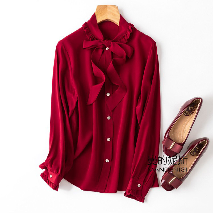 性价比!法式优雅桑蚕丝飘带领复古木耳边真丝双绉长袖衬衫女红色