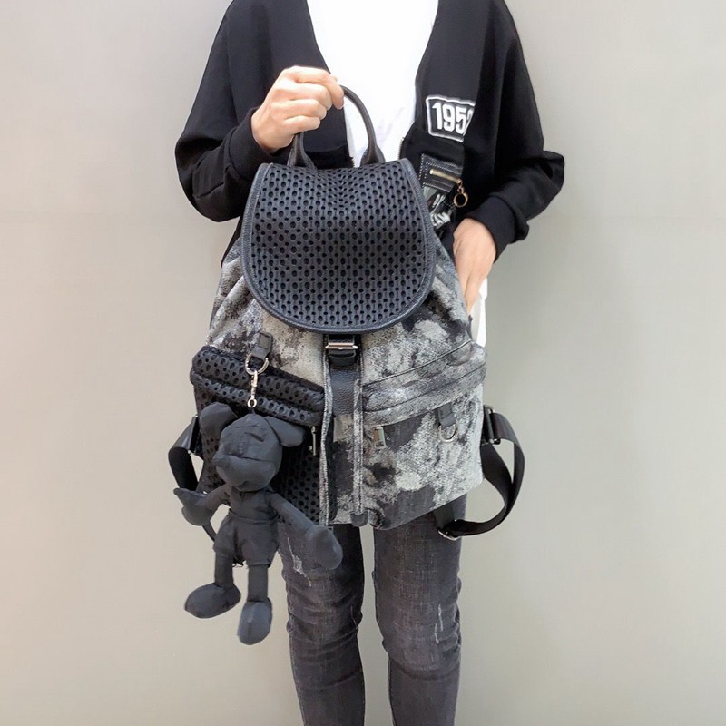 欧美时尚牛仔布复古双肩包个性抽绳翻盖背包实用多口袋包包带挂饰