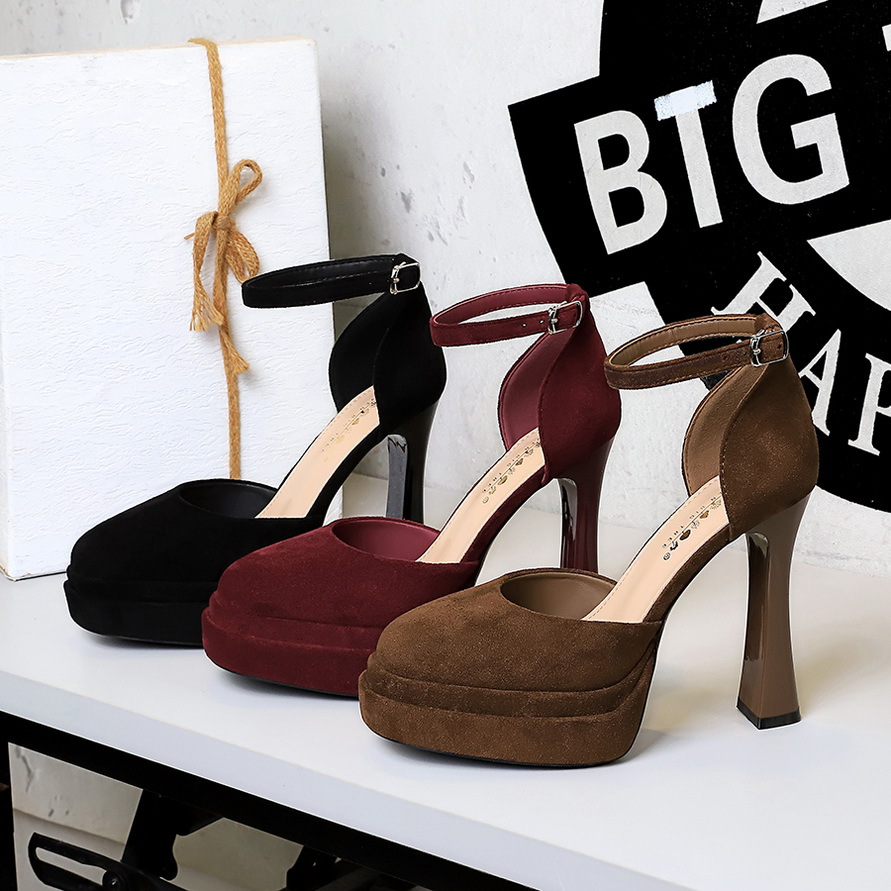 12CM粗跟气质浅口女鞋圆头绒面超跟鞋夜店性感防水台一字扣带凉鞋