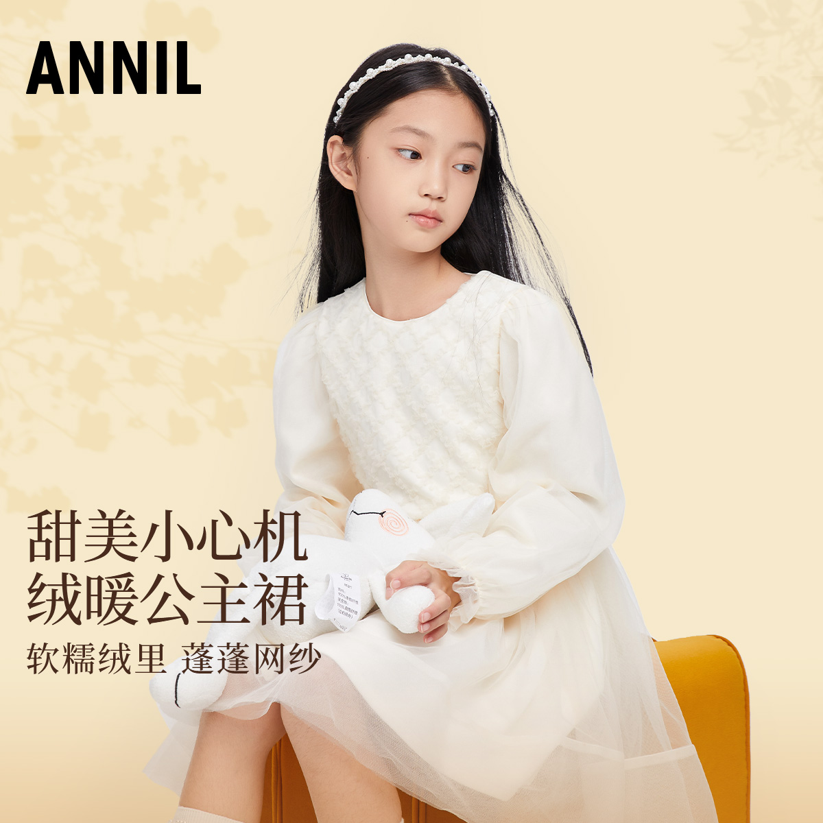 安奈儿女童装连衣裙长袖加绒冬甜美洋气纯色保暖网纱裙子