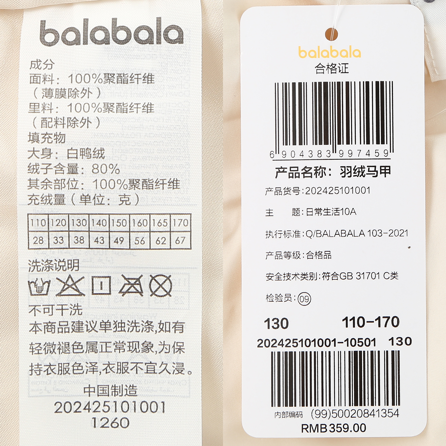 巴拉巴拉女童羽绒马甲中大童上衣2025冬儿童保暖背心202425101001